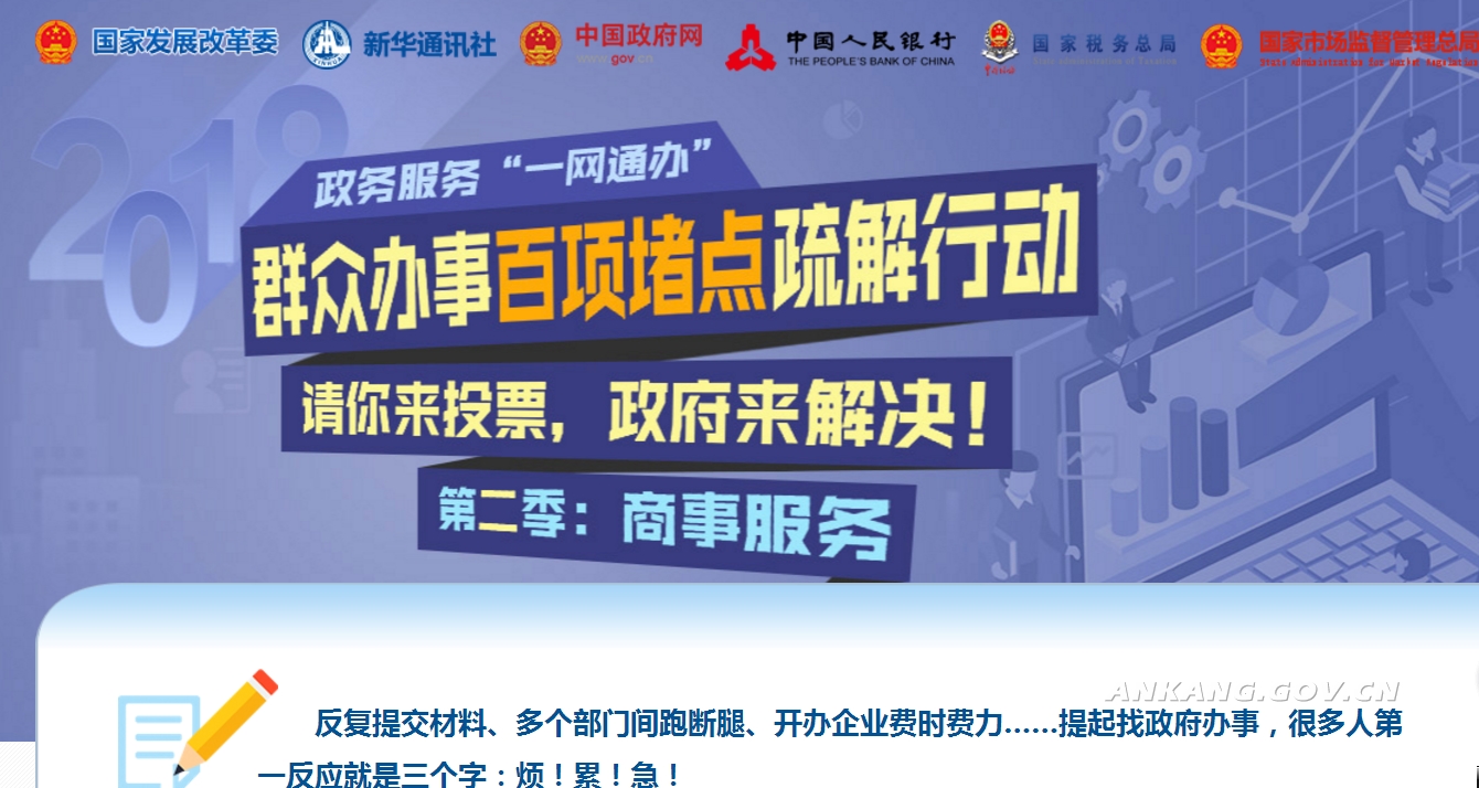 5月25日起,国家发展改革委、新华社、中国政府网联合中国人民银行、国家税务总局、国家市场监督管理总局发起第二季堵点问题征集活动,聚焦商事服务领域办事堵点问题。请结合自身所遇到的涉及营业执照、纳税证明等方面的“奇葩证明”,以及为开证明往返多地的经历填写问卷。所征集的信息经大数据分析后,我们将选择群众反映最强烈的20个“堵点”问题,推动有关地方、部门限时解决。