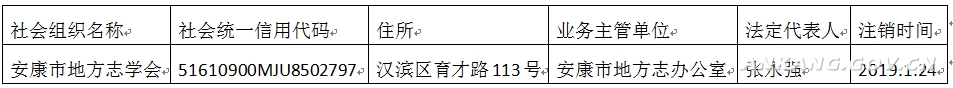 根据国务院《社会团体登记管理条例》及有关政策规定,安康市地方志学会已经我局核准注销登记,现予以公告。