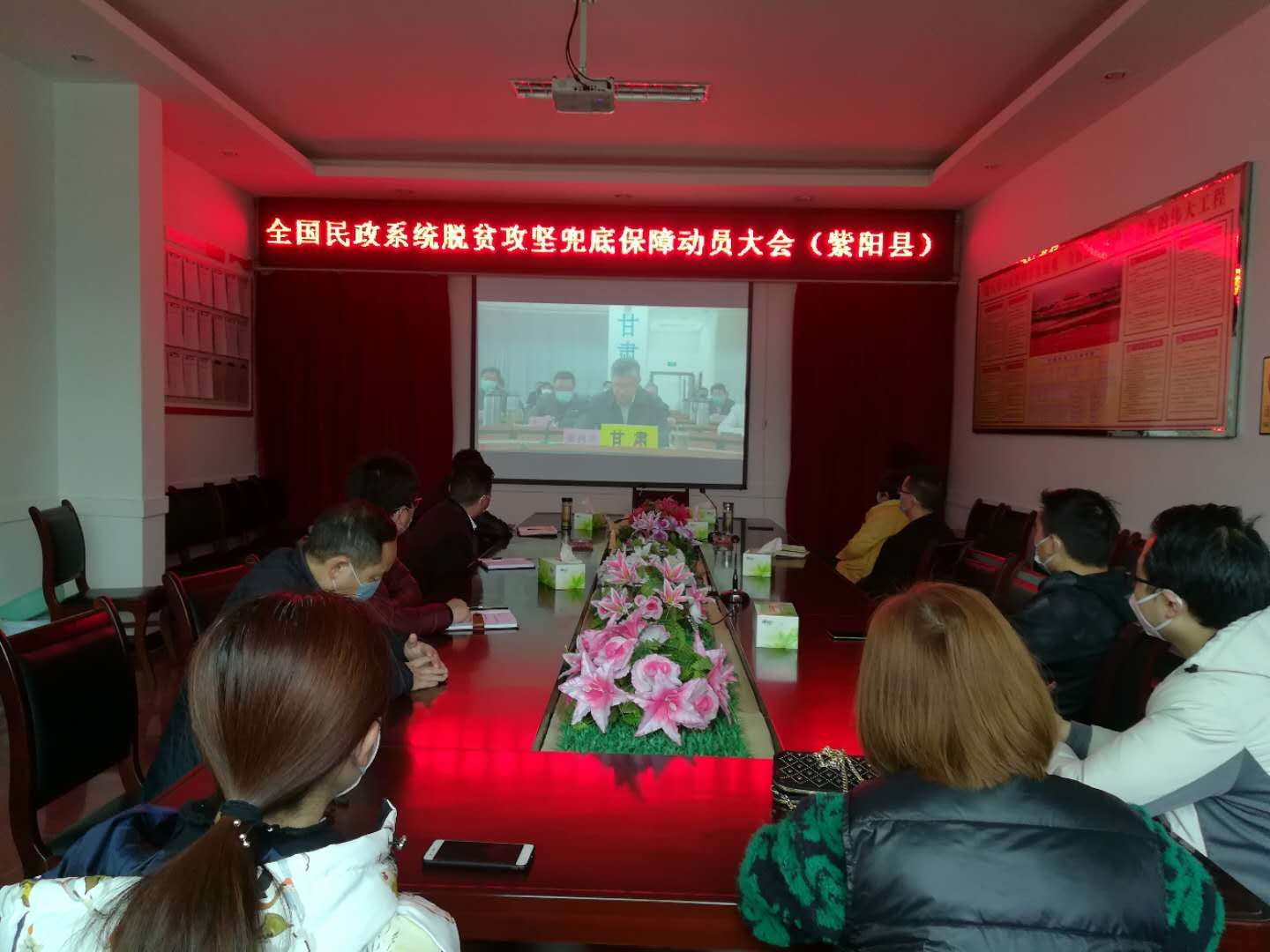 3月8日上午,安康市组织市县两级民政部门和民政福利机构集中收看全国民政系统脱贫攻坚兜底保障动员大会。会议深入学习贯彻习近平总书记在决战决胜脱贫攻坚座谈会上的重要讲话精神,安排部署全国民政系统全面贯彻落实党中央脱贫攻坚重大决策部署。民政部党组书记、部长李纪恒出席会议并讲话。