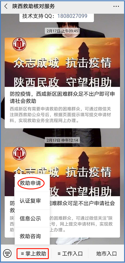 ②在公众号下方菜单找到“掌上救助”,在弹出的菜单中点击“救助申请”,即可打开救助自助申请终端;