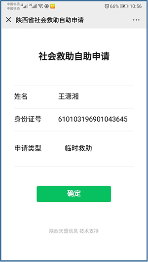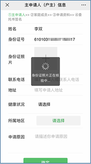 ③按要求填写主申请人信息,并进行身份证核验,请注意上传的身份证必须清晰且与申请人信息一致,出现绿色的“核验成功”字样即表示身份认证通过,之后点击“确定”按钮,如下图所示;