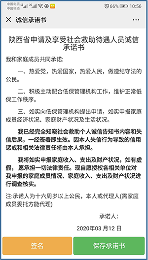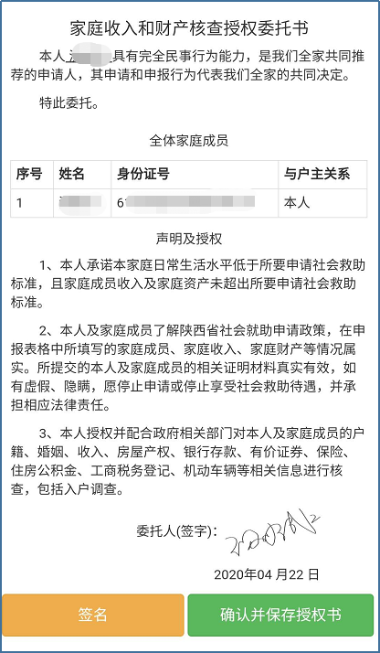 在最后您需要仔细阅读一份《家庭收入和财产核查授权书》,确认无误后请在下方委托人处签字,签字完成后即完成本次申请的全部内容。