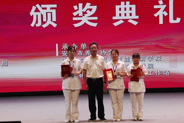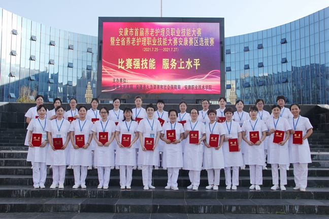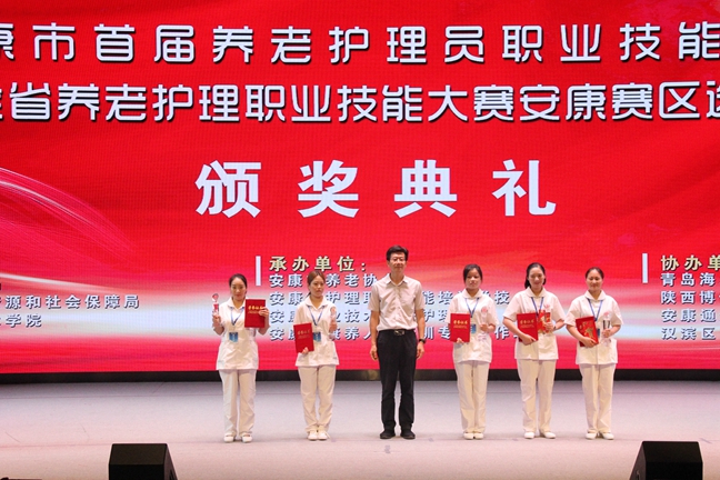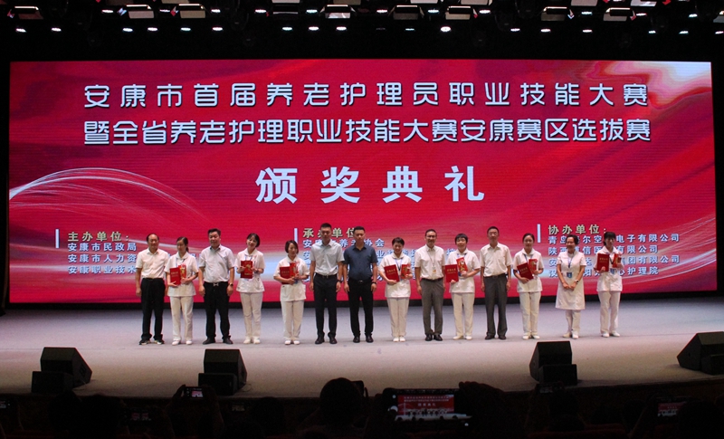 本次大赛青岛海尔空调电子有限公司、陕西博信医药有限公司、安康通达实业集团有限公司、汉滨区阳光爱心护理院协办,分为理论知识和操作技能考核两部分,全面考核养老护理员针对老年人身体、精神状况提供生活照护、基础照护、康复服务、心理支持等方面的理论和实操能力,既是安康养老事业发展和养老护理水平的一次集中展示和成果检阅,也是推进安康养老事业快速发展的重要举措。大赛自今年4月份启动以来,受到了社会各界的普遍关注,各县区养老机构积极响应,认真组织,围绕全员参与、全员提高的目标,普遍开展了岗位培训、技术练兵和技能比武活动,经过县区预赛、最终决赛,汉阴县代表队获得团体一等奖,高新区、旬阳县代表队获得团体二等奖,紫阳、平利、白河代表队获得团体三等奖;王杰、王小燕、肖雨获得个人一等奖3名,龚晓玲等5人获得个人二等奖,丁祥琴等7人获得个人三等奖。获得个人一等奖的参赛选手同时被市人力资源和社会保障局授予安康市技术能手荣誉称号。