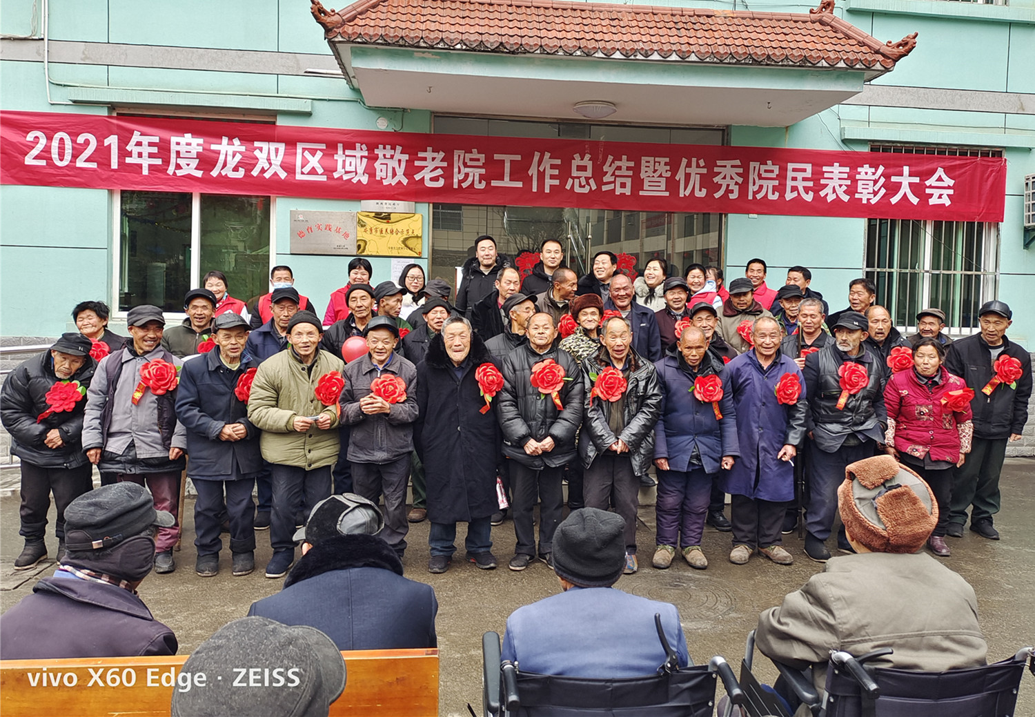 接着,会议宣读获得2021年度优秀院民的名单,工作人员为老人们戴大红花,敬老院领导为其发放奖金,并依次合影。在这一刻,幸福与喜悦洋溢在大家的脸上,虽然天气寒冷,但人心却是暖暖的。