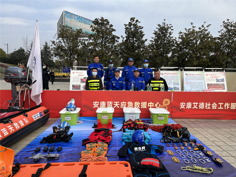 2、安康市蓝天应急救援中心参加了我市 2022 年学雷锋志愿服务月活动启动仪式,对中心的救援装备进行展示,并向市民讲解相关救援知识。