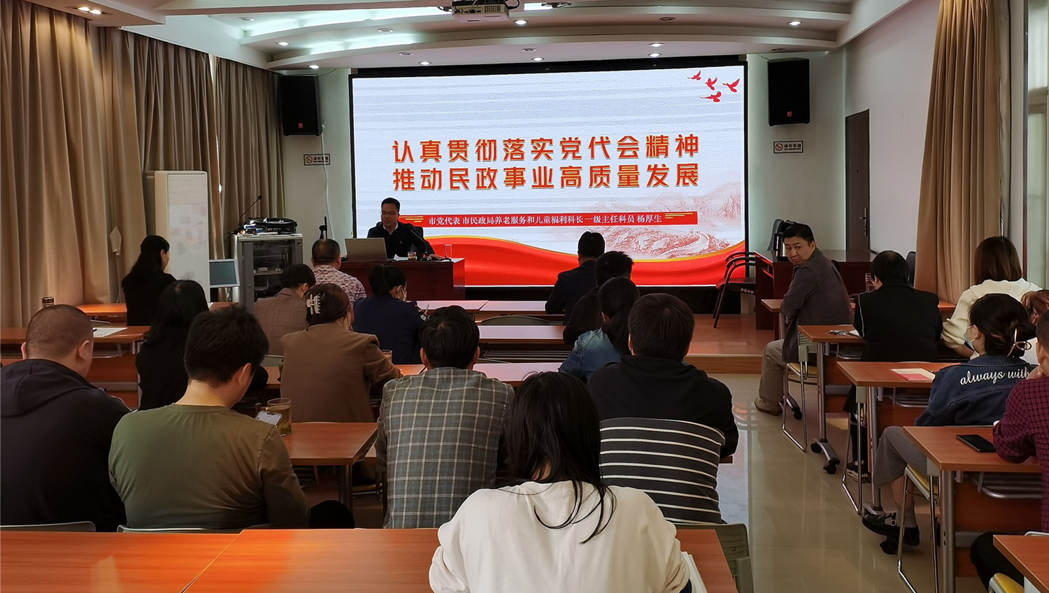会上就如何认真落实党代会的内涵意义和推动民政事业高质量发展做出了全面细致的宣讲。重点宣讲市第五次党代会报告“十新”思路,总结出报告中的“五大”特点,站位高远、主题鲜明、任务具体、思路清晰、导向鲜明,为我们开启现代化建设新征程指明了前进方向。