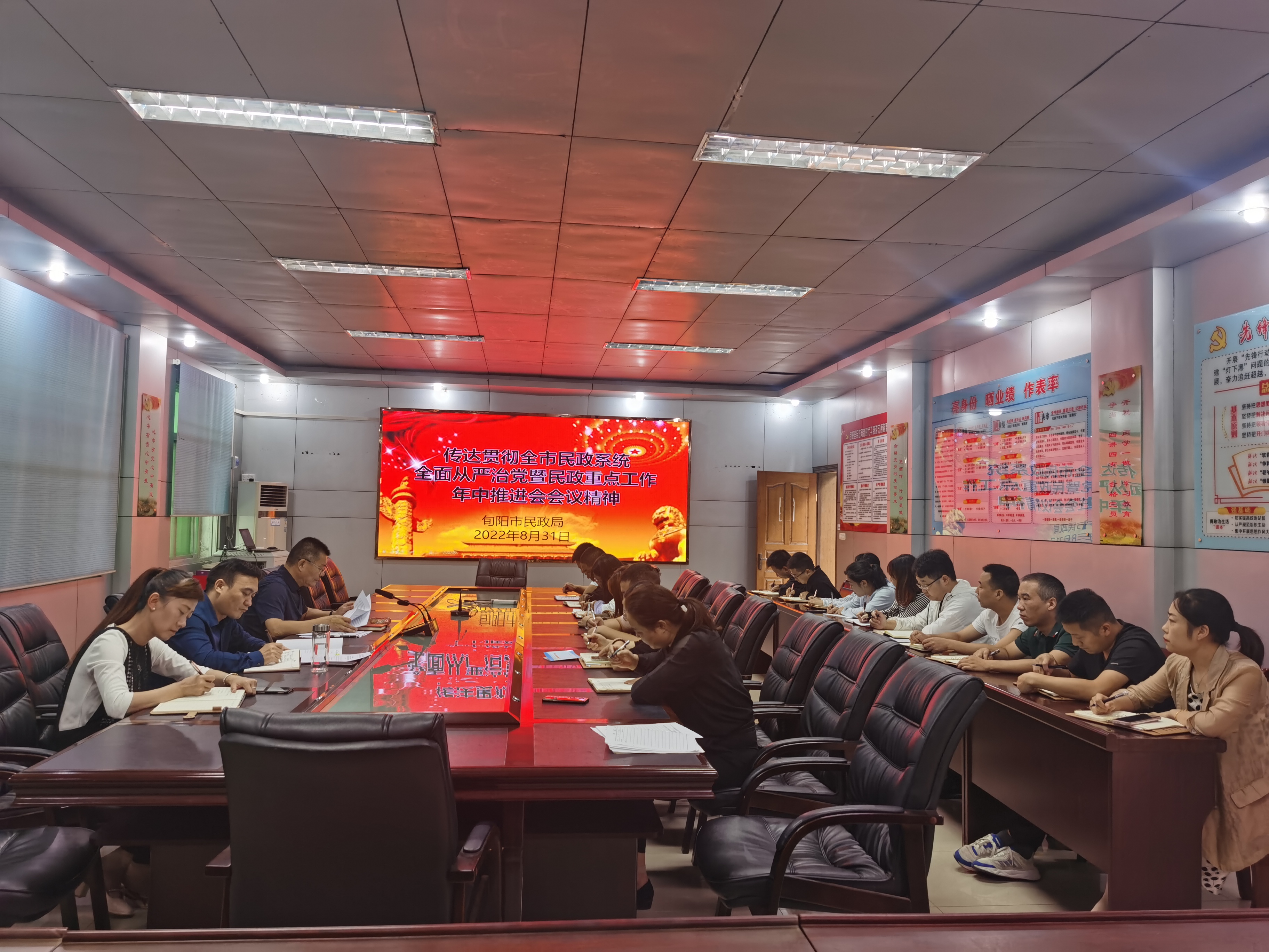 会议要求,一是要清醒思想认识。严格落实“第一议题”和理论学习中心组学习制度,要持续学习领悟习近平总书记系列重要讲话重要指示精神,要始终胸怀国之大者,把“民政为民、民政爱民”的理念作为全面推进落实旬阳高质量发展的底线,切实增强责任感。二是要勤于学习,善于钻研。要对标市局的各项要求来切实谋划推进好工作,在工作中争先进位;要研究市局的工作导向、项目支持方案及重点工作方向,在项目建设中要善于谋划、敢于谋划,对照问题导向,补短板强弱项。要算清时间账,对照上级考核方案和标准,结合年度工作要点及市局对县区民政、市委市政府对民政部门的考核以及上年度目标责任考核结果,查找问题及时补齐短板弱项;要加快项目推进,按照市局的要求要善于探索,创新工作,总结提炼。三是要切实改进工作作风。要苦干、实干、巧干,对标对表省厅、市委市政府关于加强和改进工作作风方面意见来推动民政工作提质提效,在工作落实中督促推进。把“勤快严实精细廉”的要求贯穿于工作、学习、生活全过程,时刻绷紧纪律之弦,以初心不改、决心不变、力度不减的劲头,确保各项工作提质增效。四是持续加强安全稳定工作。要切实加强民政机构消防安全、疫情防控安全,兜牢民生底线,做实困难群众生活救助补助资金审计反馈问题专项治理“回头看”,通过专项治理,进一步完善监督管理体制机制漏洞,形成长效长治。要切实做好民政领域各项矛盾信访风险防范化解,确保安全稳定,用实际行动迎接党的二十大胜利召开。五是坚持全面从严治党。要从严落实党组主体责任,落实好“一岗双责”,加强对党员干部的严管真管,通过对干部的严管严要求来锻造一支过硬的民政队伍。要建立良好的政治生态,坚持纪法警示教育,纪律制度约束,让全体党员干部心存敬畏,心有戒惧,严格落实“第一议题”制度和集体决策制度,管好关键事、关键人。
