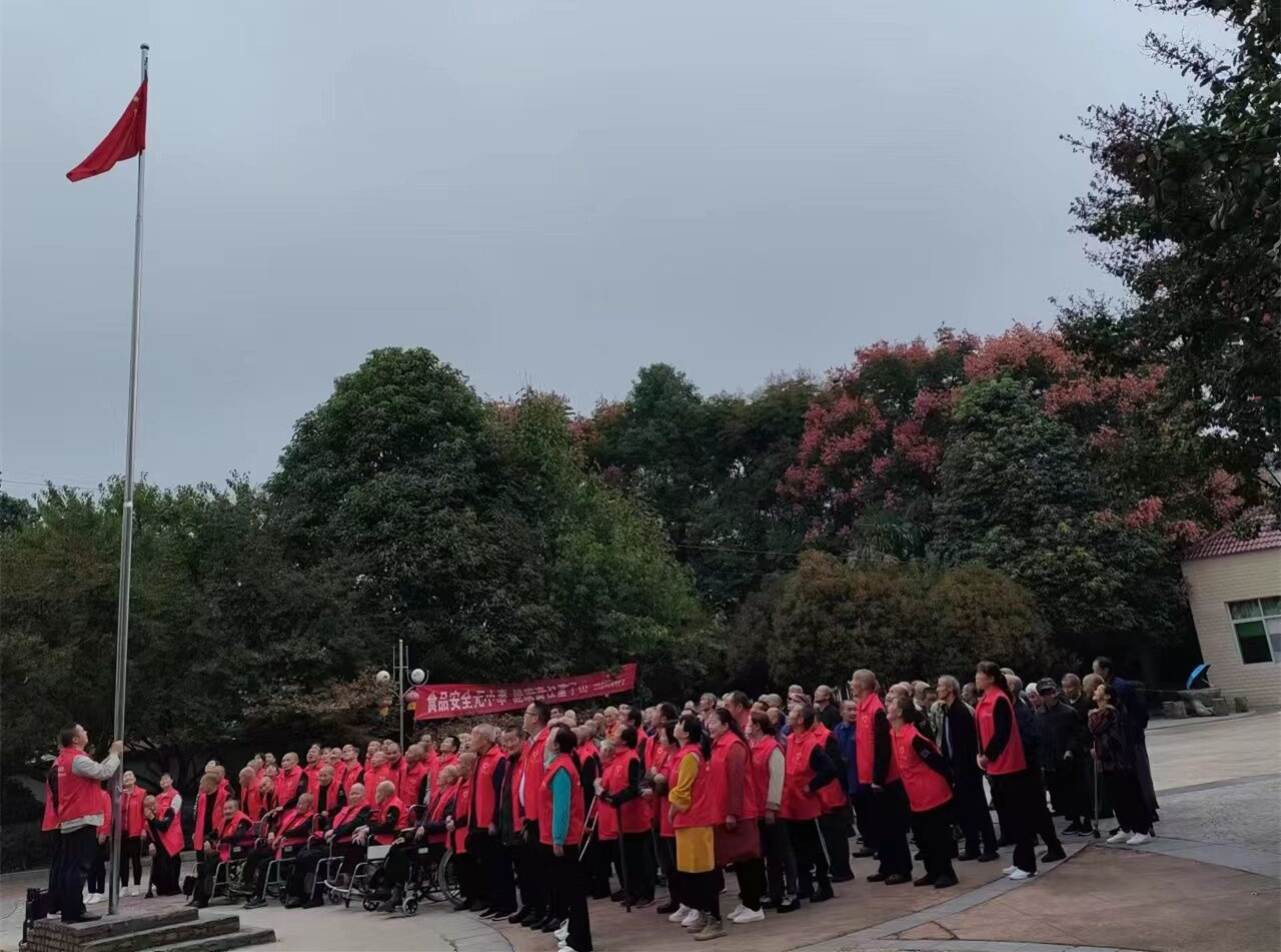 早晨8点,院内老人和工作人员在敬老院内小广场上庄严肃立,伴随着嘹亮的国歌,大家对冉冉升起的五星红旗行注目礼。