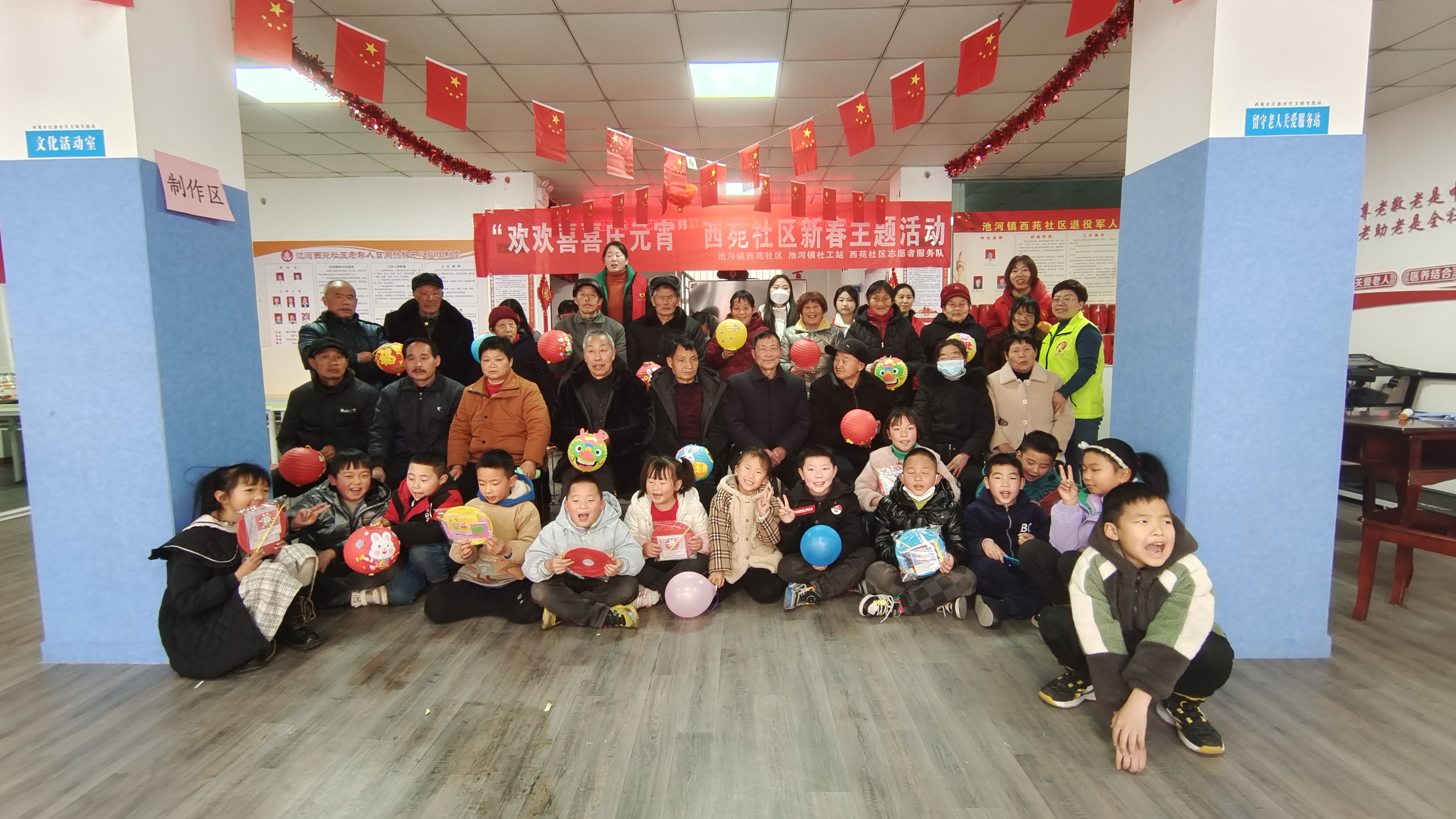 为进一步弘扬中华优秀传统文化,丰富辖区群众文化生活,强化社会主义核心价值观宣传教育,2月2日下午,池河镇社工站联合西苑社区新时代文明实践所共同开展“花灯祈福迎新春 欢欢喜喜闹元宵”主题活动,社区“红马甲”志愿者、文艺爱好人士、留守老人、儿童们汇聚一堂,做花灯,包汤圆,现场张灯结彩,喜气洋洋。