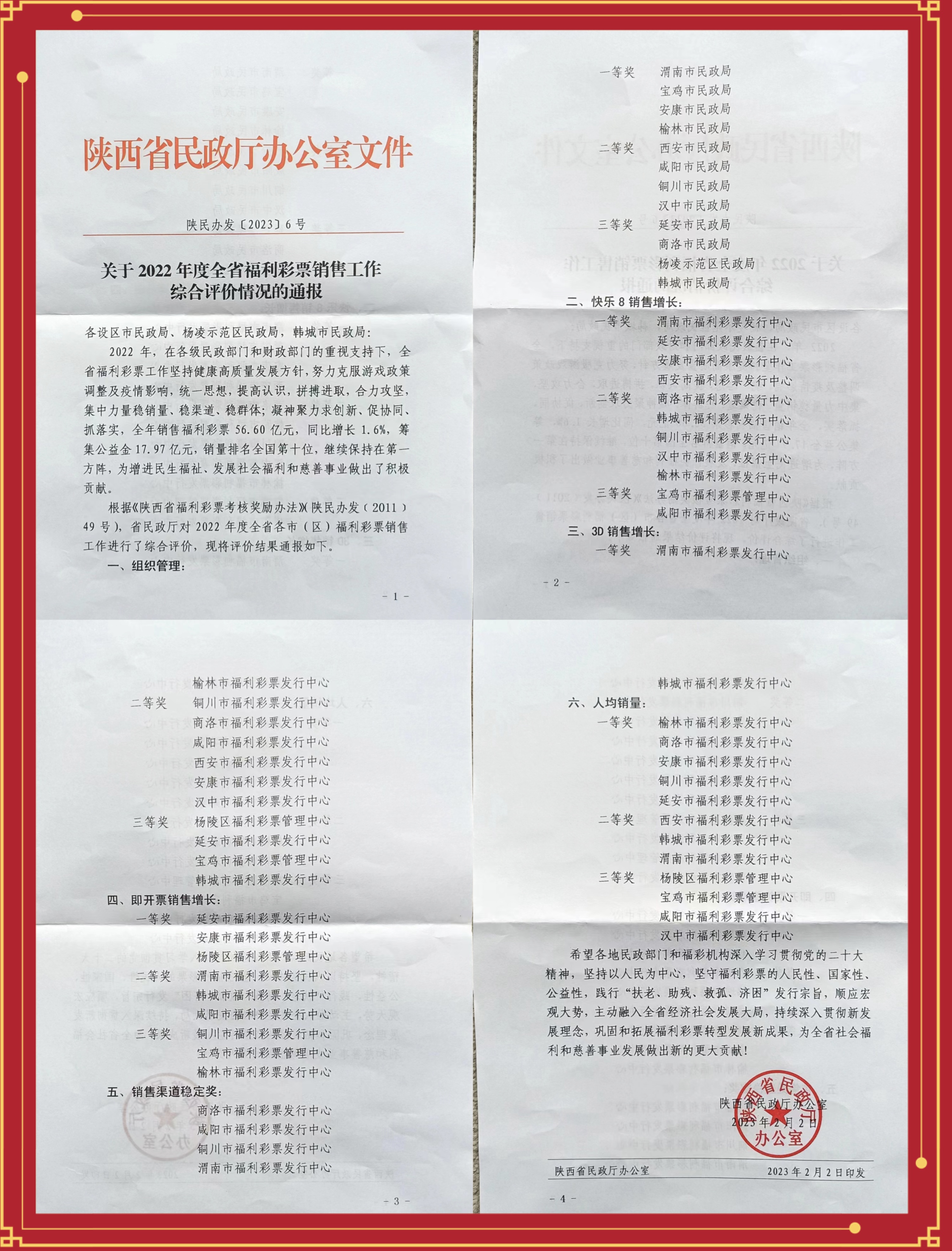荣获“2022年度全省福利彩票销售工作综合评价组织管理一等奖”;安康市福利彩票发行中心荣获“2022年度快乐8销售增长一等奖、即开票销售增长一等奖、人均销量一等奖、3D销售增长二等奖”等多项表彰。