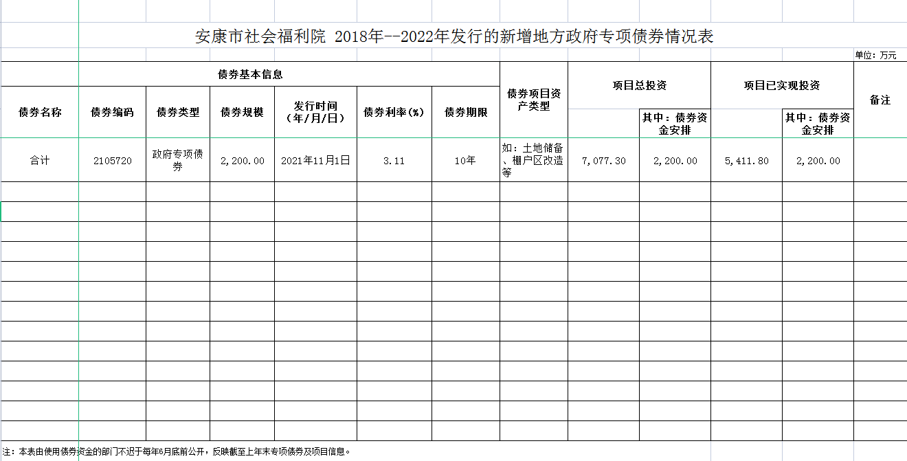 安康市社会福利院2018年——2022年发行的新增地方政府专项债券情况表