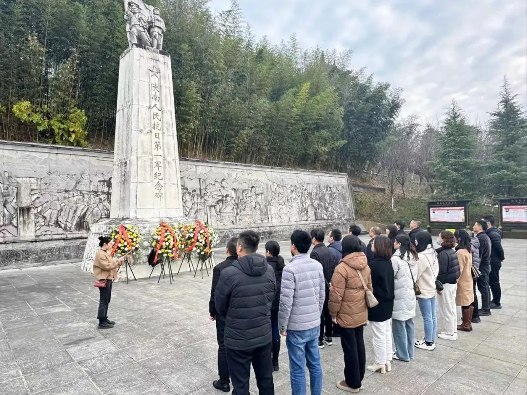 在陕南人民抗日第一军纪念碑广场, 向英勇牺牲的革命先烈敬献花篮、默哀致敬,表达对革命英烈的怀念和崇敬之情。全体党员重温入党誓词,感悟初心使命,感受革命先烈为了革命事业和人民幸福而奋斗的精神。