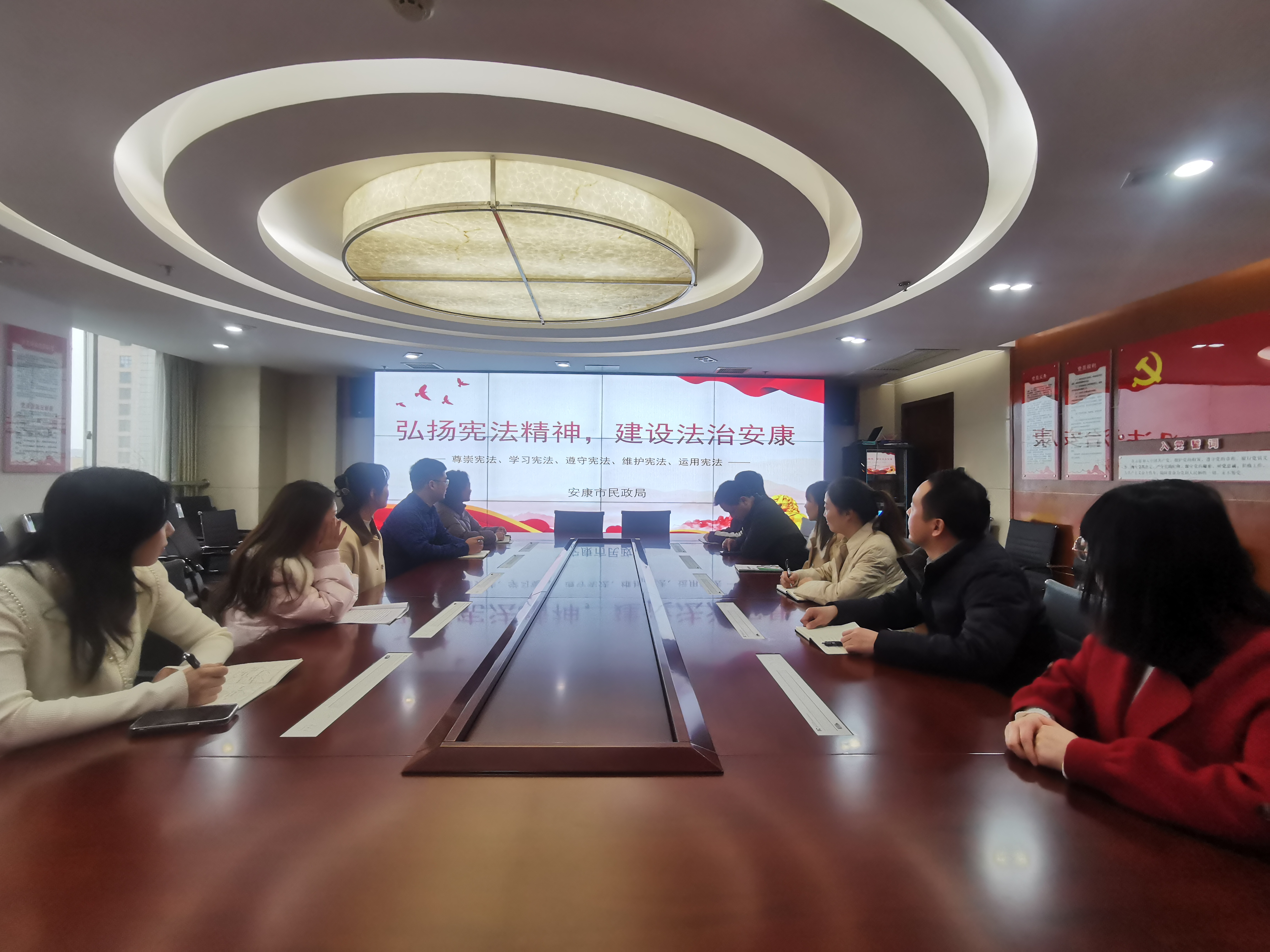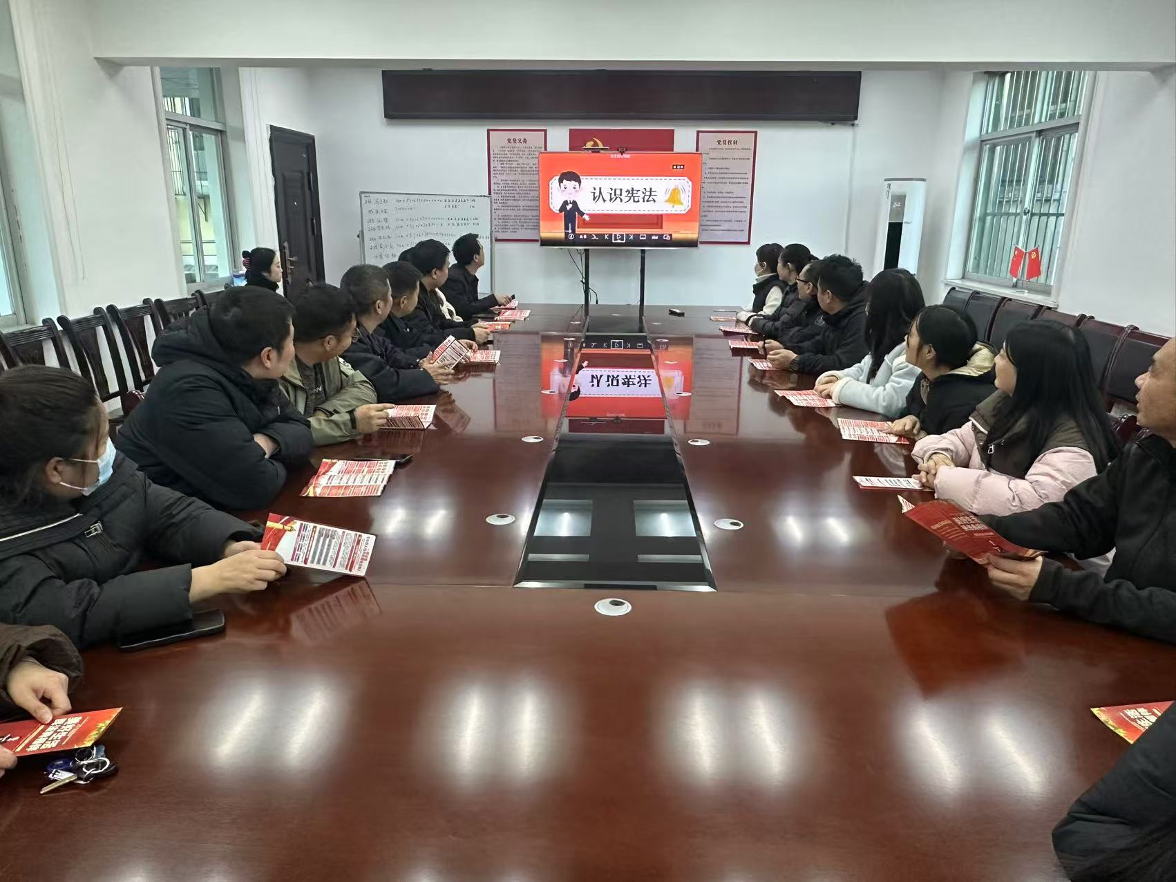 引法进机关。通过张贴宪法宣传标语,在电视大屏幕、LED屏滚动播放宪法知识小视频等方式,营造宪法宣传浓厚氛围;积极组织召开“12·4学法普法”交流会,并集中观看宪法知识讲解视频,让干部职工深刻认识到《中华人民共和国宪法》的重要性与必要性。