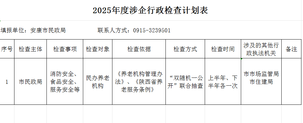 2025年度涉企行政检查计划表