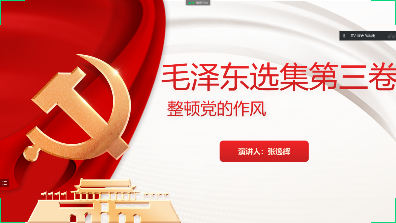 学生党员张逸辉与各位同志一同学习了毛泽东选集第三卷整顿党的作风,从主要背景、主要内容和重要意义三个方面展开介绍:1941年,抗日战争进入了极为严重的困难时期,这就更为迫切地需要我们党加强自身建设,在思想上、政治上、组织上更加团结统一和更加巩固,这是战胜严重困难、坚持抗战的决定性因素整风运动正是在这样的背景下,有领导、有计划、有步骤地首先在延安从党的高级干部开始的。1942年2月1日,毛泽东在延安中央党校开学典礼大会上作了《整顿学风党风文风》(收入《毛泽东选集》时改为《整顿党的作风》)的报告,明确提出:“反对主观主义以整顿学风,反对宗派主义以整顿党风,反对党八股以整顿文风,这就是我们的任务。”整顿党的作风为破除党内把马克思主义教条化、把共产国际决议和苏联经验神圣化的错误倾向,树立马克思主义的实事求是的思想方法指明了方向,提出了党风问题对党的建设发展革命胜利具有极为重要的价值。在党和人民群众的关系上提出了一系列新见解,同时为执政条件下的党的建设提供了宝贵的经验。