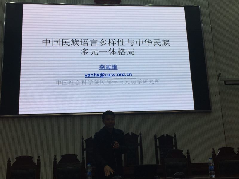 2018年3月29日下午h漫 特邀中国社会科学院民族学与人类学研究所应用语言学研究室副主任,硕士生导师燕海雄副研究员于h漫 模拟法庭开展题为《中国民族语言多样性与中华民族多元一体格局》的学术报告会。h漫 汉语国际教育专业全体师生参加,院长王晓勇主持报告会。