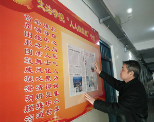 为响应河南省委的号召,进一步发挥党报党刊思想舆论主阵地作用,h漫 积极开展了“学讲话 读党报 为中原添彩”活动。2月24日上午9:00,h漫 党委书记李培玉为学院“人人读党报”专栏张贴第一期党报。