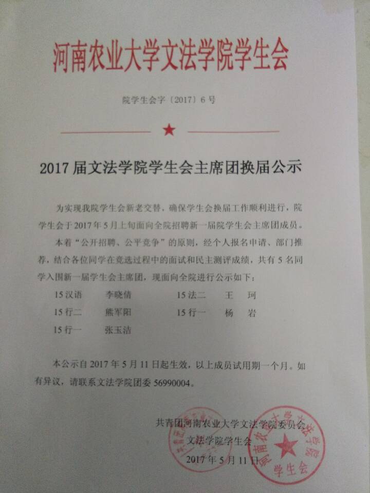 于近日在教学楼举行了学生会、社管会主席团换届选举大会。院团委书记沈倩茹、团委副书记赵蕊、党委组织员朱瑞萍、推免生辅导员叶青出席,各学生班班长、团支书,学生会、社管会代表参加。
