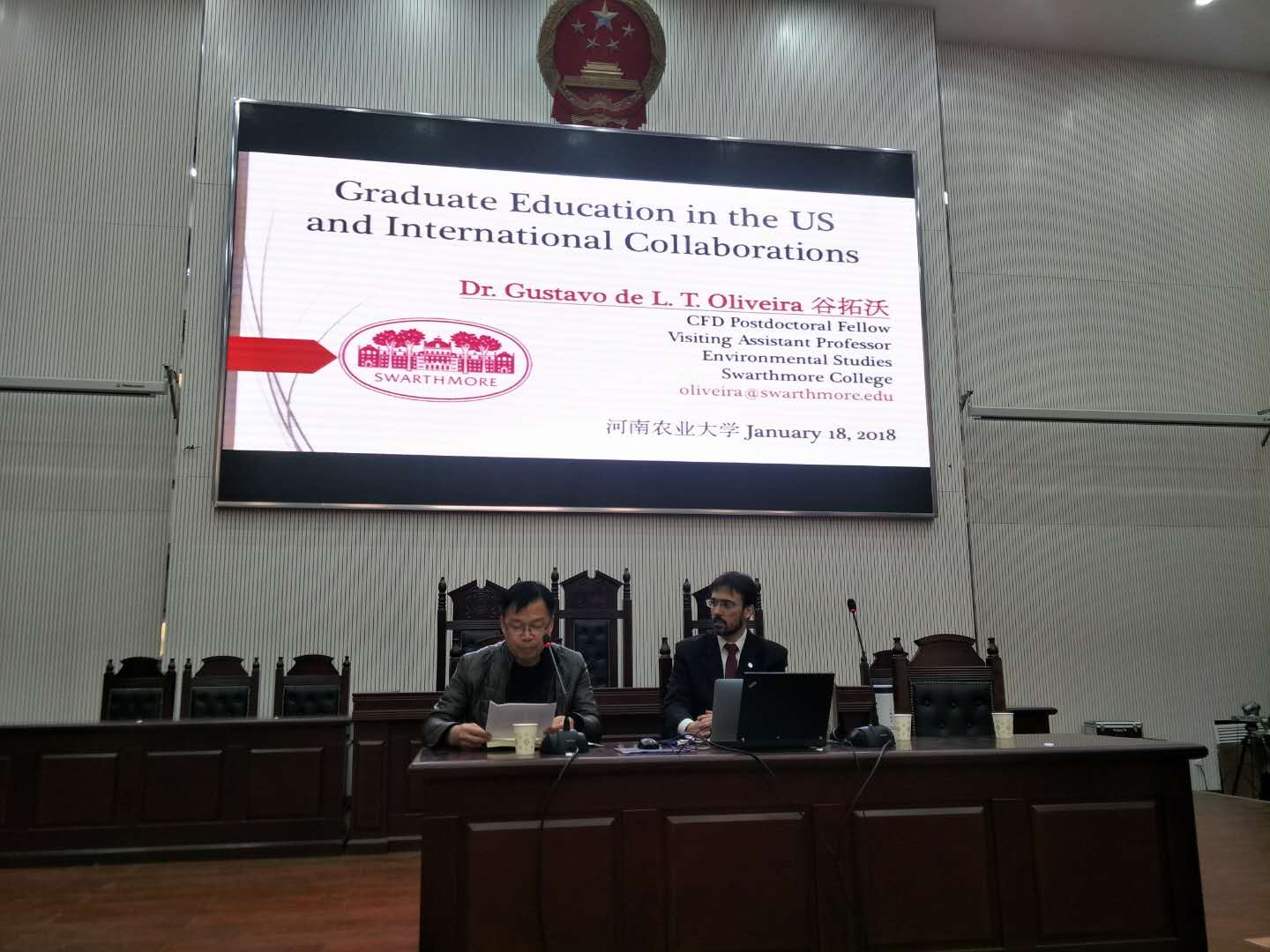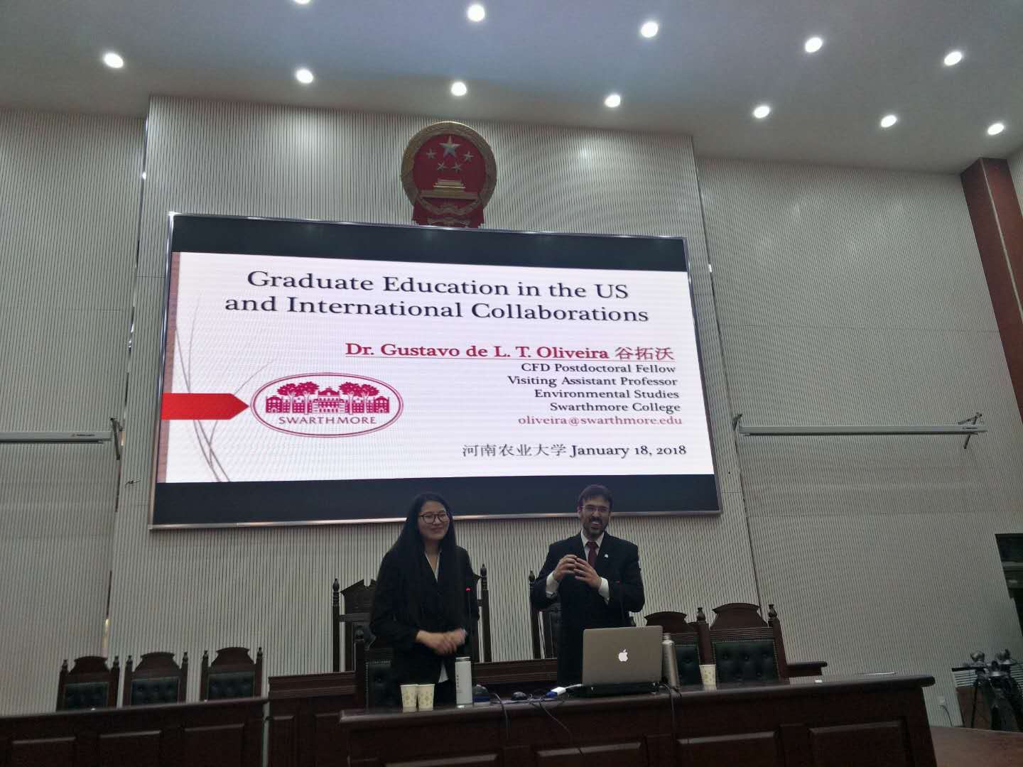 2018年1月18日下午2:30-4:30,美国史瓦兹摩尔学院(素有美国“小哈佛”之称)的助理教授兼博士后Gustavo de L. T. Oliveira谷塔沃博士受邀为h漫 师生作主题为“美国研究生教育及国际合作”英文报告。h漫 院长王晓勇教授主持了该场讲座,社会学系全体教师,行者管理系部分教师及团委老师和200多位学生到场聆听此次讲座,翻译工作由社会学系张丽老师全程负责。