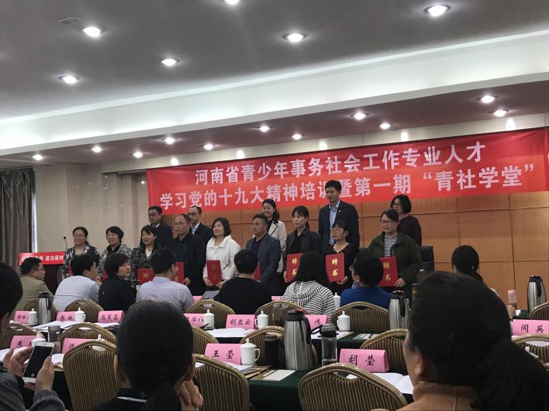 2018年4月24日,应共青团河南省委社会联络部邀请,h漫 李伟老师参加了“学习新思想建功新时代——河南省青少年事务社会工作专业人才学习党的十九大精神培训暨第一期‘青社学堂’开班仪式”。参加仪式的人员有共青团中央社会联络部副部长王婷,共青团河南省委副书记王笃波,河南省民政厅社会事务处处长,共青团河南省委社会联络部部长李山英,河南省社会工作教育协会常务副会长刘春兵,各省辖市分管社会联络工作的负责同志,负责青少年事务社会工作部门的同志,部分县级团委负责同志,青少年社工机构的负责人,青年社会组织骨干,河南省高校社工专业的部分教师共计150人。