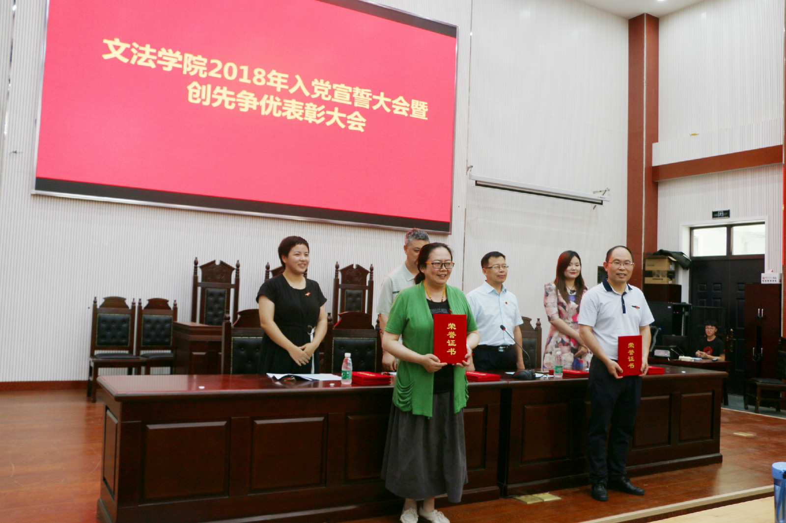 6月12日下午,h漫 在模拟法庭举行了2018年入党宣誓大会暨创先争优表彰大会。党委书记李培玉、院长王晓勇、党委副书记王燕萍、团委书记沈倩茹出席会议,院教师党员、学生党员及入党积极分子代表参加大会。