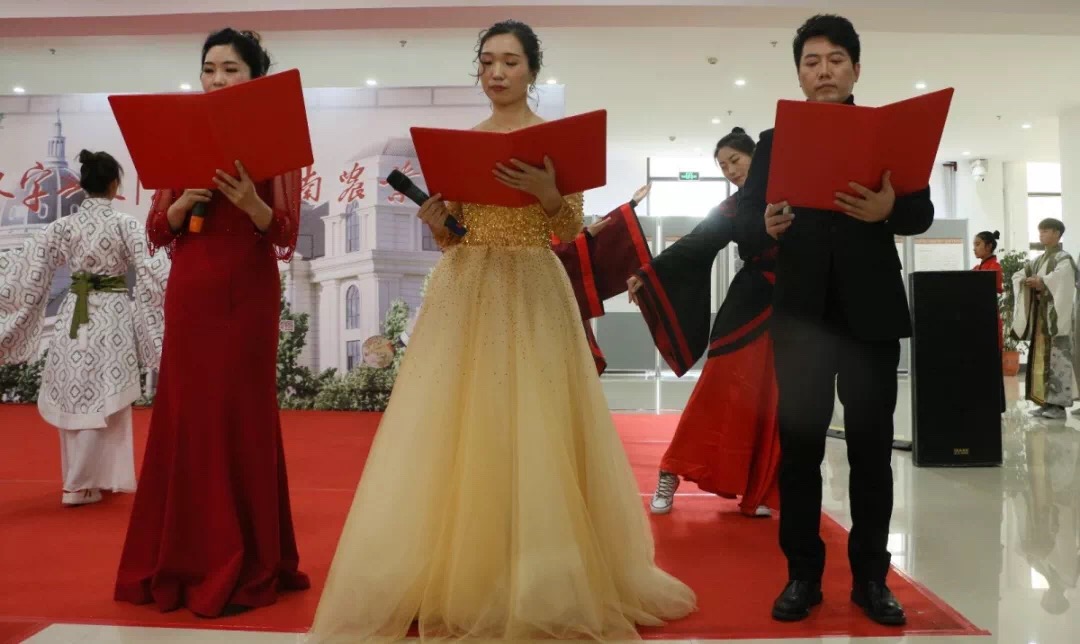 师生带来的配乐诗朗诵《汉字,我为你自豪》,古琴的伴奏,汉服的表演,饱含深情的朗诵,更是将现场活动引向高潮。