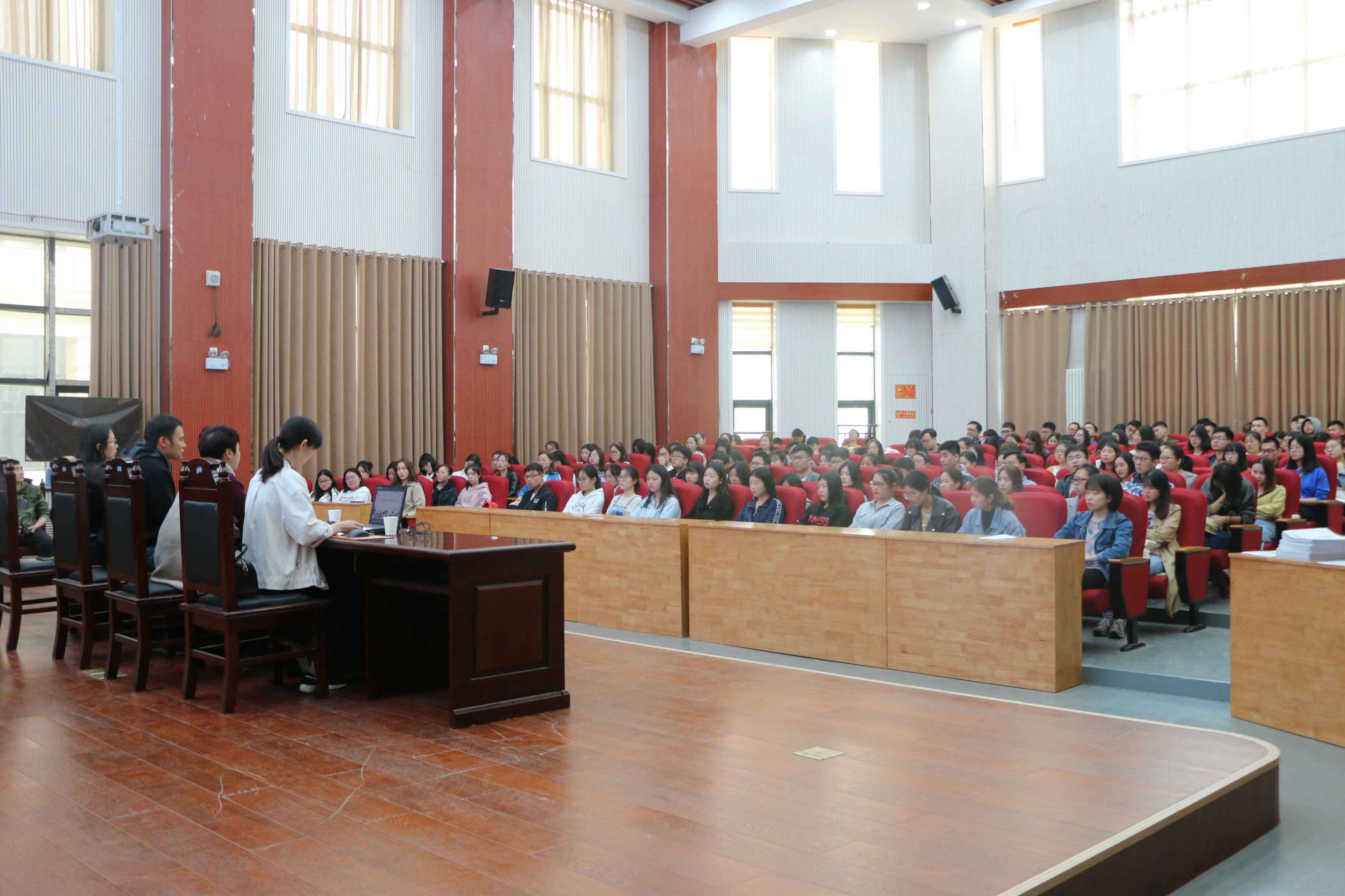 于2019年4月16日在模拟法庭召开“勤学 笃行”学风建设动员大会。本次大会由团委副书记赵蕊主持,党委副书记王燕萍,党委组织员朱瑞萍以及18级全体学生参加本次动员大会。