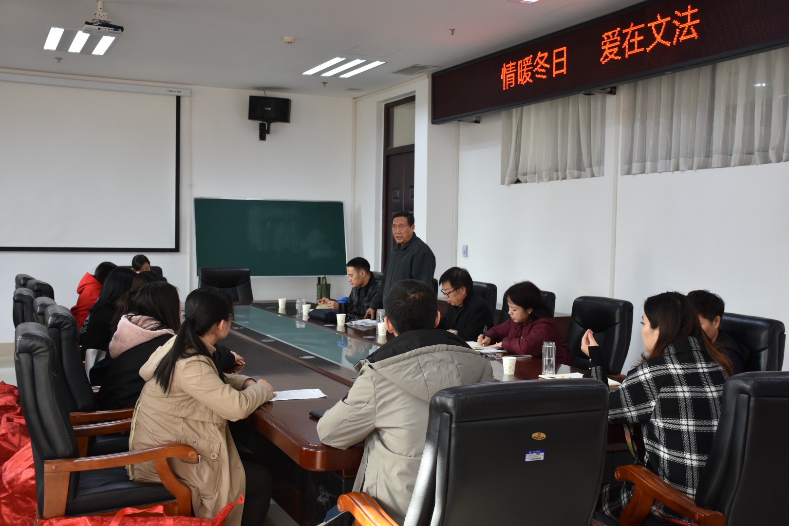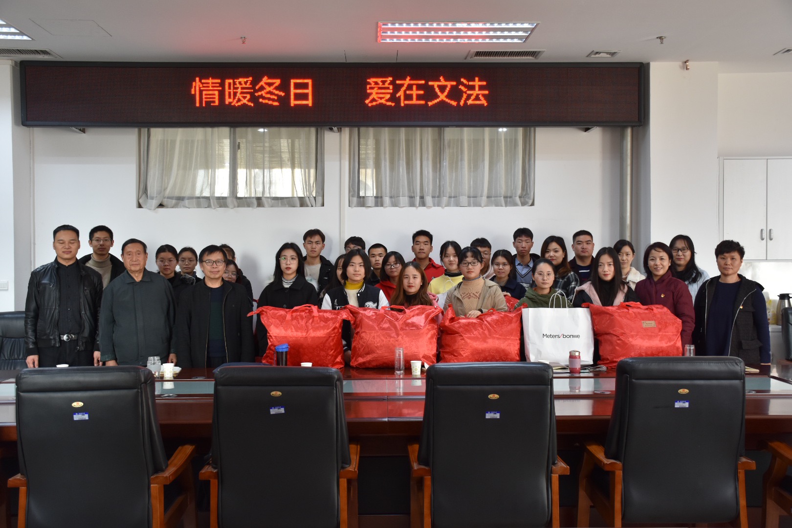 活动伊始,王燕萍书记宣读了h漫 “情暖冬日,爱在文法”活动的通知。在场领导给受助学生发放了棉被、棉衣和棉鞋等物资。受助学生代表汉语国际教育1班程鑫进行了发言,表达出受助学生对学院深厚关怀的感激之情,并表示定会认真学习,增强自身本领,以优异的成绩,为学院添彩,为母校增辉。最后,杨明亮教授作总结讲话,再次传达了国家和学校对学生的关怀与爱心,希望学生把感激转化为动力,乐观向上,脚踏实地,发奋学习,成长为国家的栋梁之才。