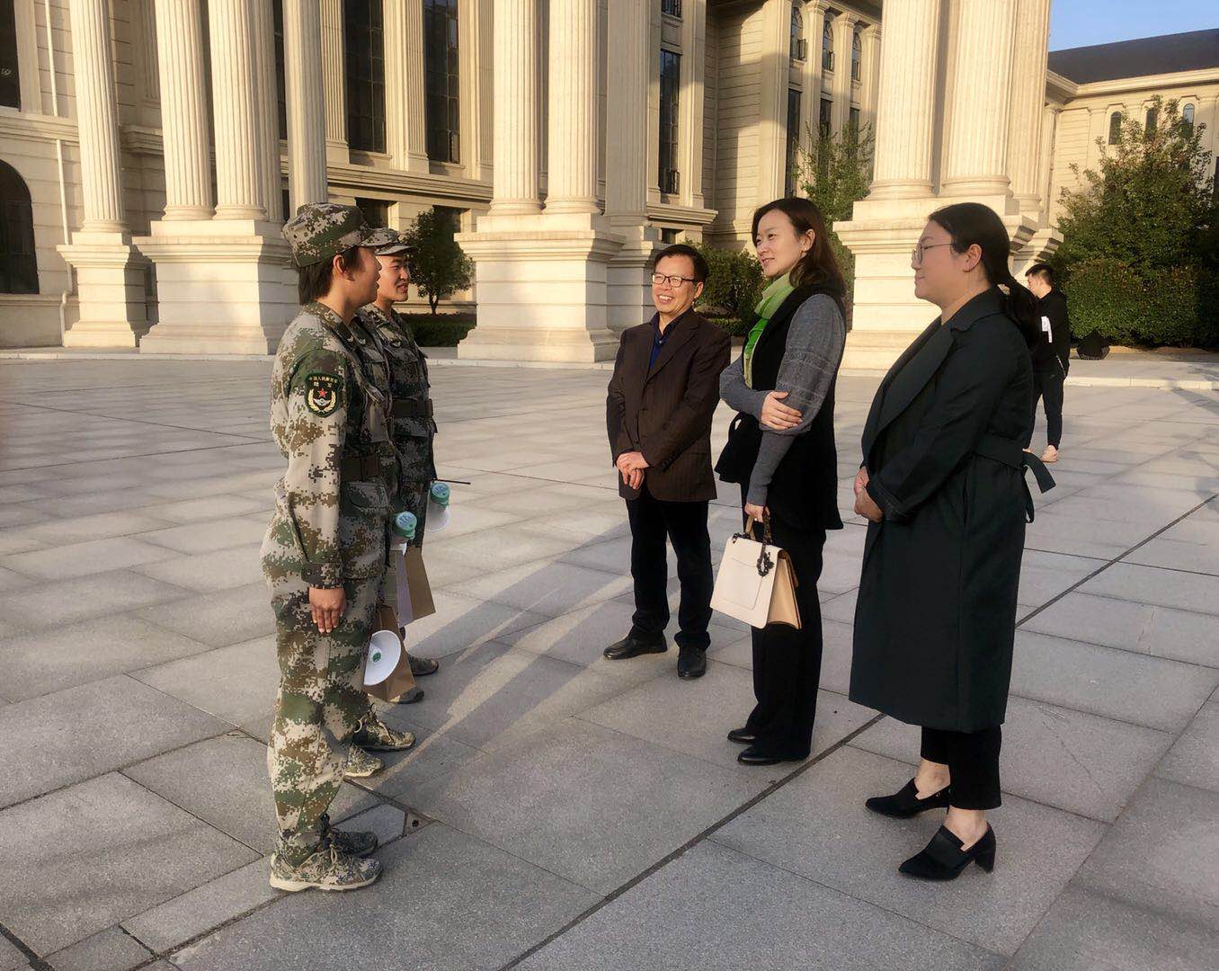 牛娟一行看望了军训的教官们,与他们亲切交谈,赞扬他们在训练中所展现出的坚韧不拔的优良品质,并为军训教官送去了慰问品。军训教官们表示军训虽然艰苦,但练就了同学们吃苦耐劳、团结协作的精神品质,这让他们感到无比骄傲和自豪。训练场上,新生的分列式方块队正在训练,他们动作规范整齐、步调一致,展现出文法学子自强不息的精神风貌。