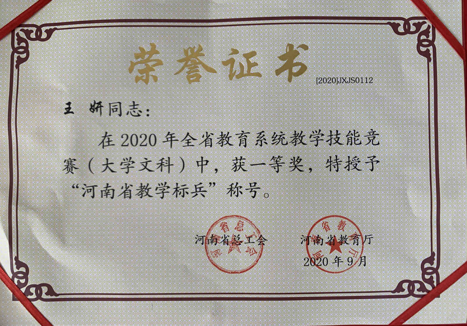 “河南省教学标兵”证书
