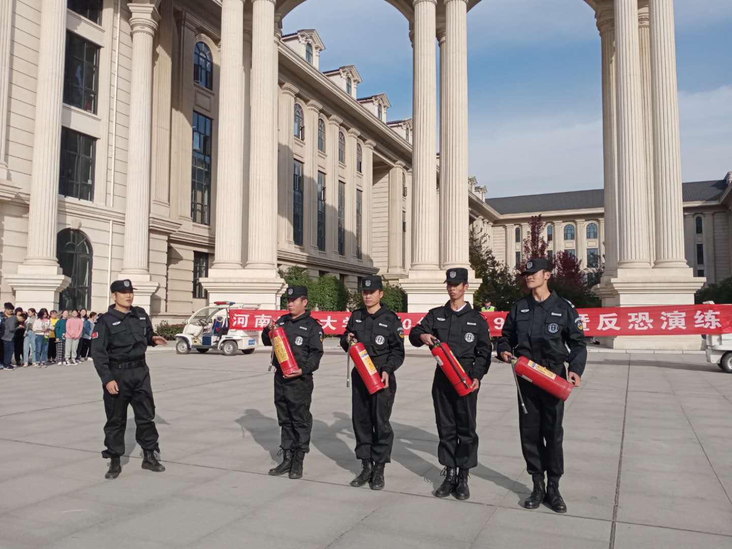 保卫处人员为h漫 学生讲解灭火器使用方法