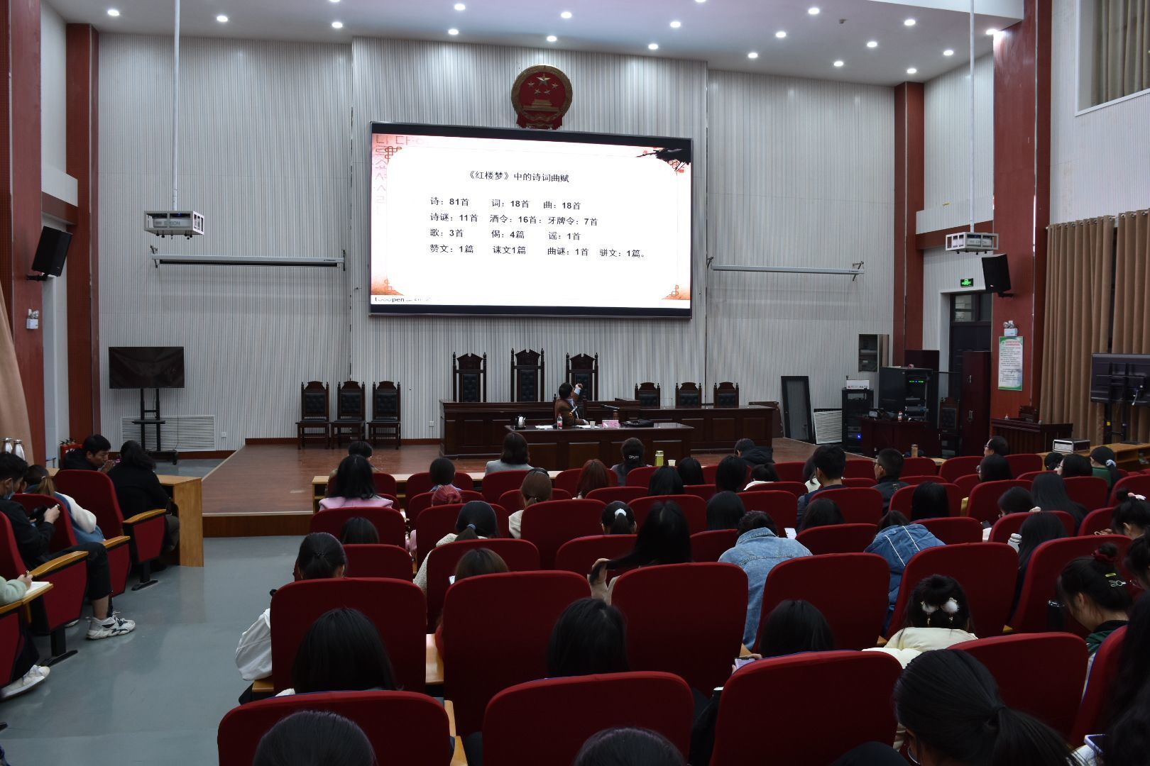 穆乃堂用幽默风趣的语言从《红楼梦》中看社会的变迁,看人物的沉浮升降,结合作品中的人物形象、诗词歌赋和经典篇章,旁征博引,让《红楼梦》这部名著更加生动地展现在同学面前,深深地吸引了在场的师生。最后,在现场问答环节中,穆乃堂教授热情、细致地回答了学生对讲座内容的提问。
