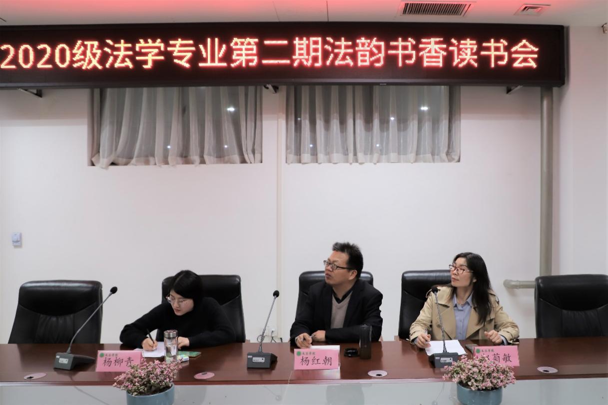 20级法学专业在院会议室举办2020级法学专业第二期“法韵书香”读书会。副院长杨红朝,法律系教师赵菊敏,20级法学二班班主任杨柳青以及20级部分法学专业学生参加此次读书会,读书会由杨柳青主持。