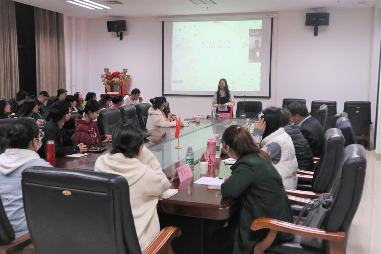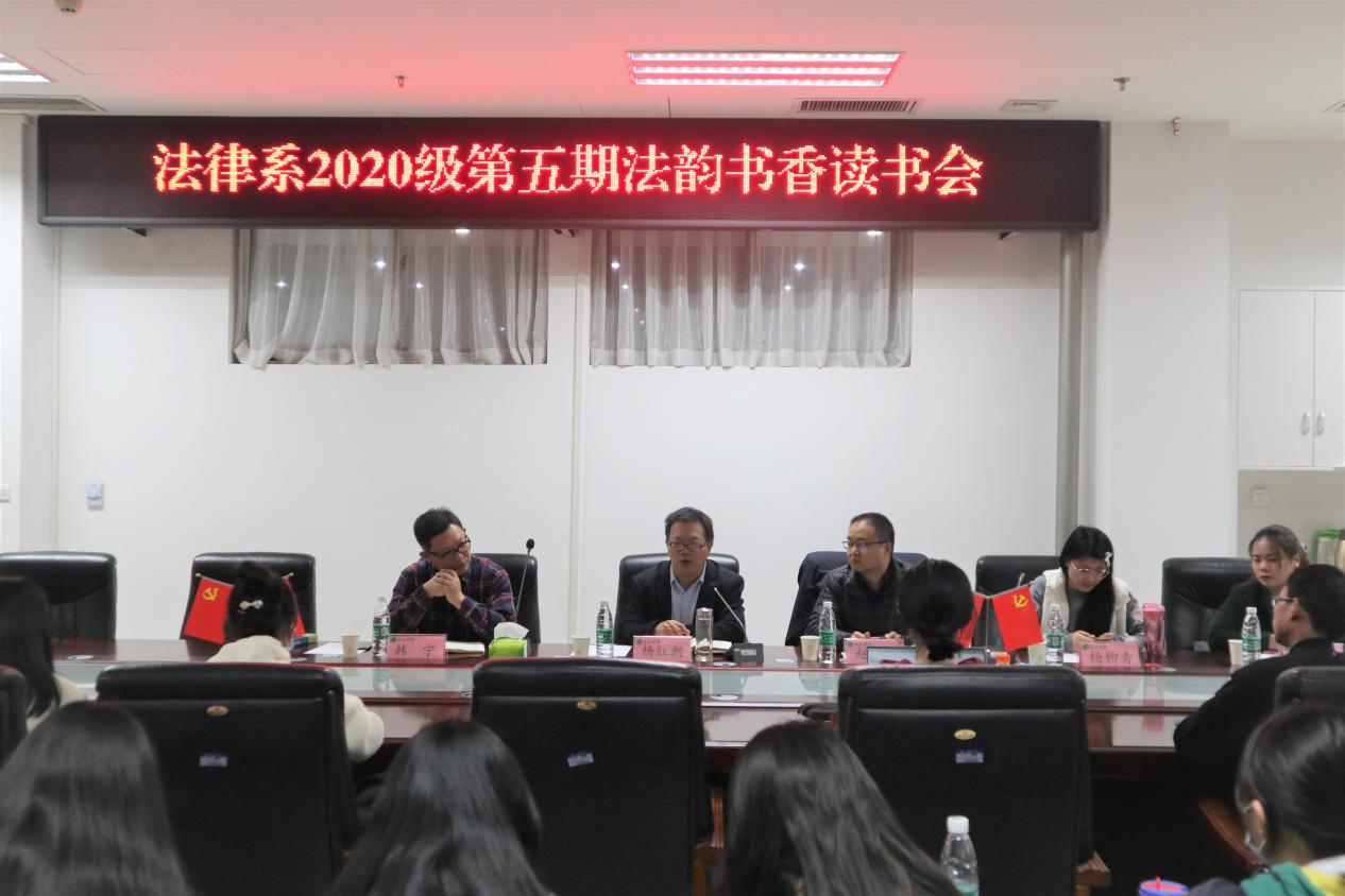法学专业在院会议室A310举办了“法律系2020级第五期法韵书香读书会”。本次读书会特邀河南财经政法大学赵亚老师、黑龙江大学民商法学王亚霈博士及我校法律系优秀毕业生刘振轩学长做点评和分享,会议由2020级法学二班班主任杨柳青主持,副院长杨红朝、法律系主任韩宁及法律系部分教师和法学专业学生代表参加读书会。