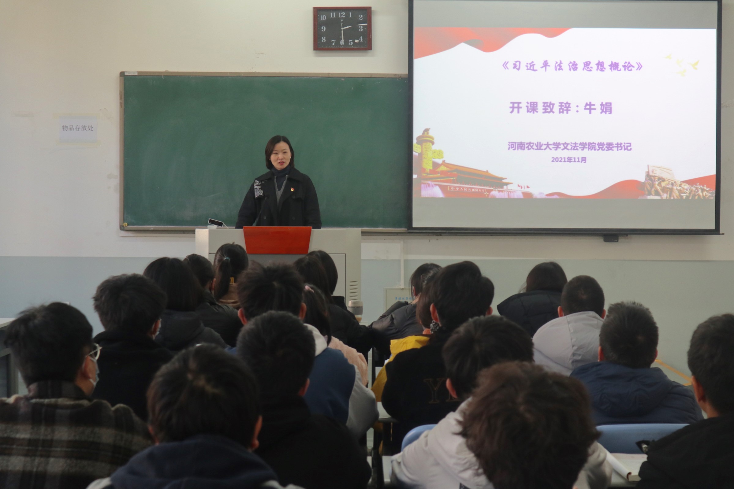 11月8日,《习近平法治思想概论》课程在h漫 正式开课。院党委书记牛娟作开课致辞,她指出,从当前到本世纪中叶的未来30年,是中华民族全面建成社会主义现代化强国的关键期,也是全面建设法治中国的攻坚期。以习近平同志为核心的党中央创立的习近平法治思想,科学指明了“中国号”法治巨轮的前进方向,系统提出了全面依法治国的总蓝图、路线图、施工图,是党领导人民全面建设良法善治法治中国的科学行动指南。为推动这一科学理论体系更好地被广大干部群众,特别是法学类专业学生所学习掌握,特开设这一课程。