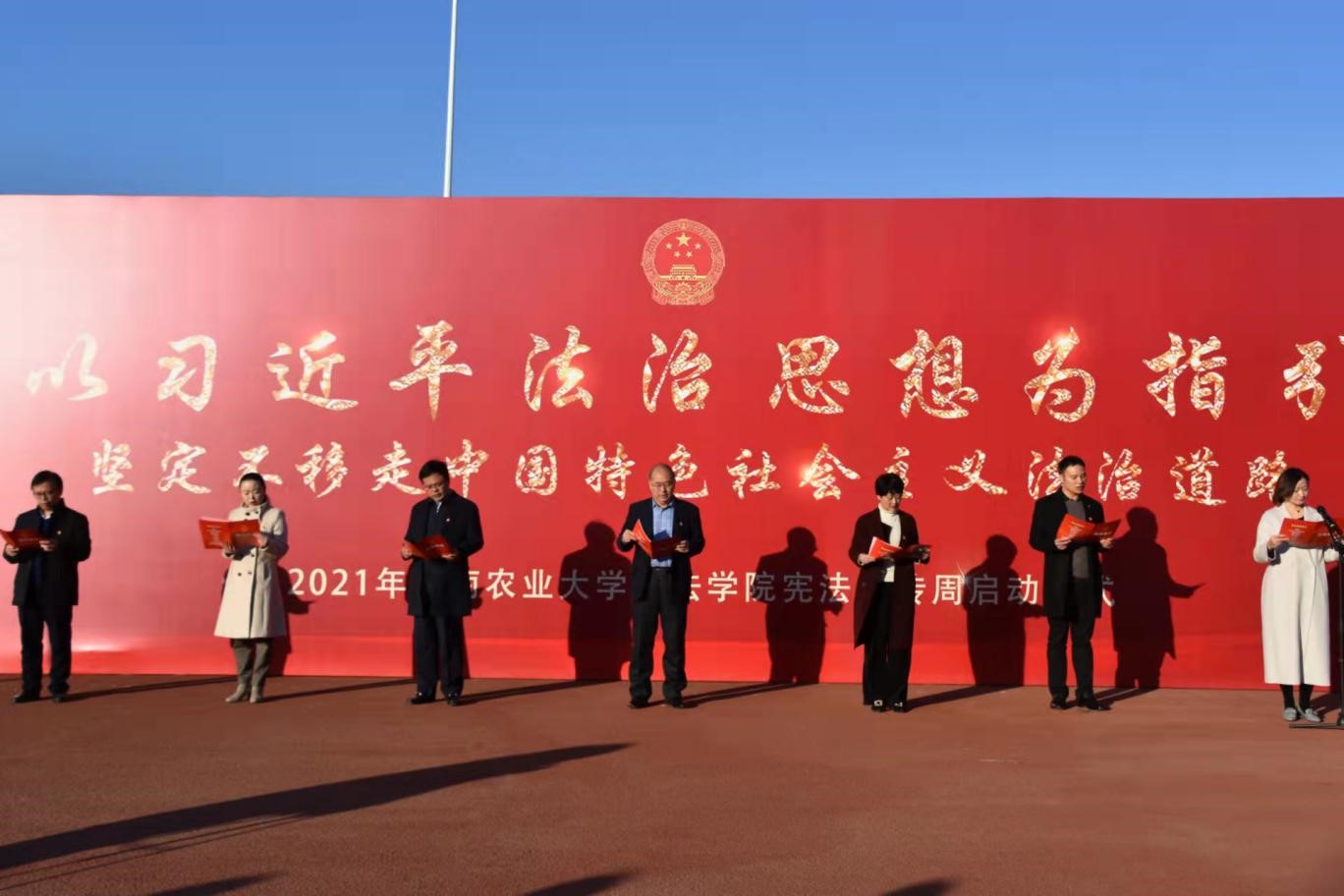于龙子湖校区田径场举办“以习近平法治思想为指引,坚定不移走中国特色社会主义法治道路”宪法宣传周启动仪式。副校长林同保出席仪式,校党委宣传部部长王红艳、党委学工部部长徐峰、政策法规办公室副主任张帅梁、校团委副书记雷雯及h漫
