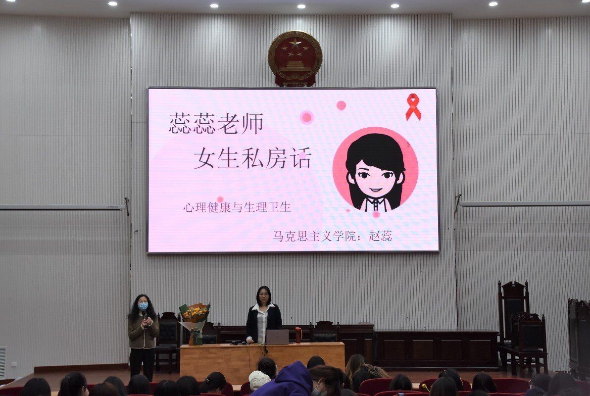 于龙子湖校区模拟法庭开展“悦纳生活 健康护航”系列之蕊蕊老师女生私房话活动。活动邀请到我校马克思主义学院教师赵蕊担任主讲嘉宾,2021级辅导员赵梦闪、全体女生参加活动。
