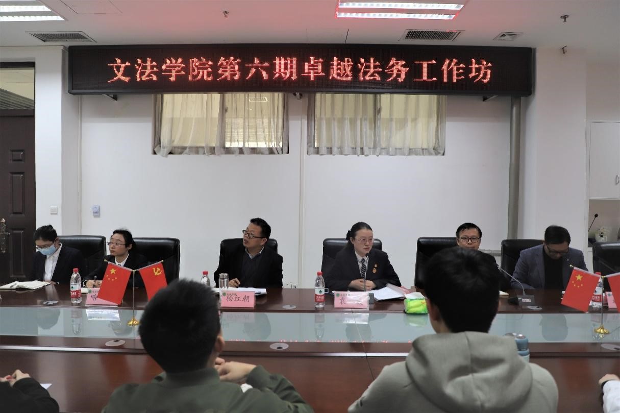 第六期“卓越法务工作坊”。院长王晓勇、副院长杨红朝及部分法律系师生参与本次活动,活动由法律系主任韩宁主持。