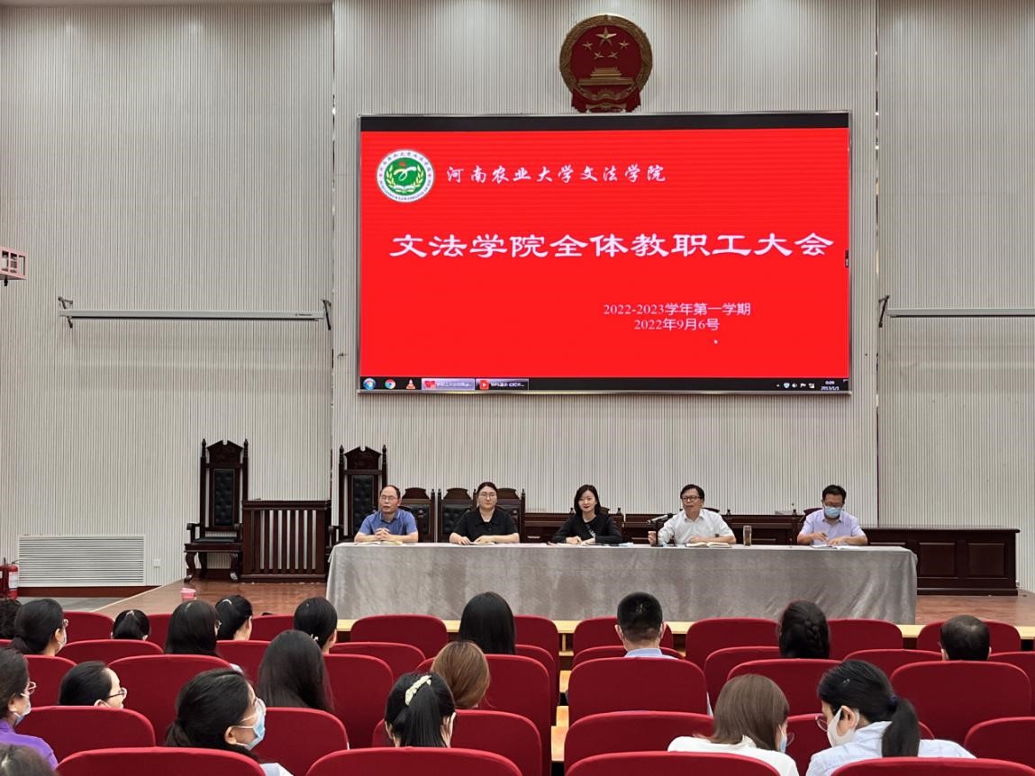 在龙子湖校区模拟法庭召开2022年秋季学期全体教工大会,学院领导班子和全体教师参加会议。会议由院长王晓勇主持。