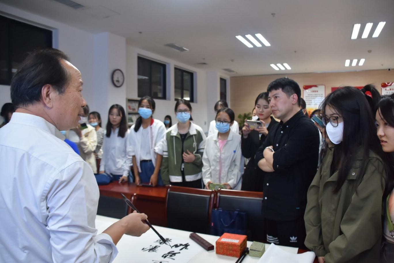 实践环节,田立杰执笔染墨,挥笔成书,h漫 院训顷刻落于宣纸之上,师生在提笔落笔之间直观感受到了书法艺术的清新高雅、古朴端庄。