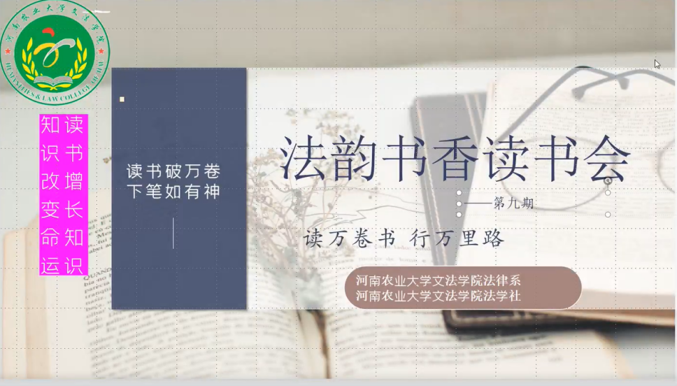 通过线上方式举行了第九期法韵书香读书会。法律系主任韩宁、法学社及法学专业部分学生参加读书会,会议由韩宁主持。