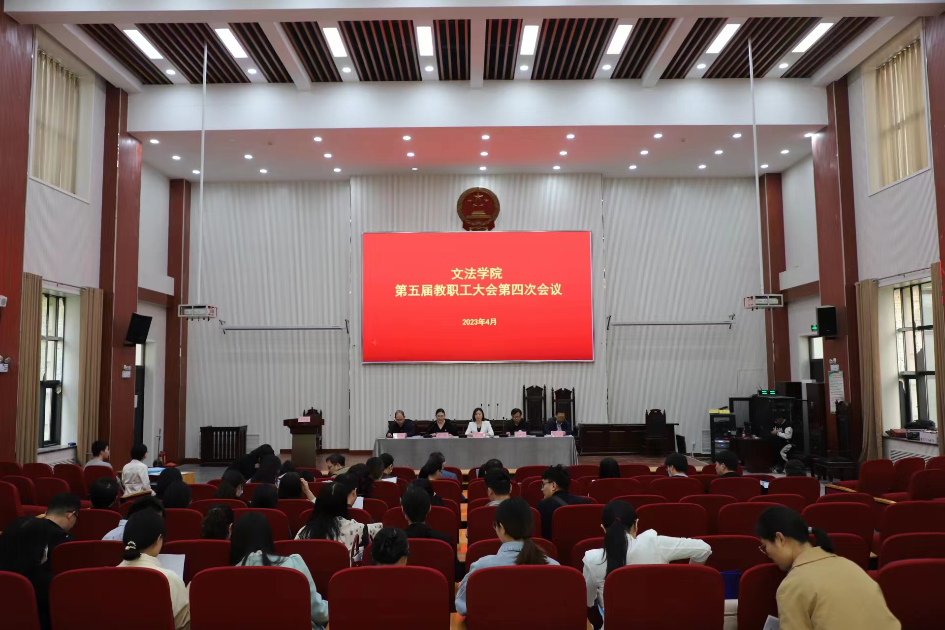 在龙子湖校区模拟法庭召开学院第五届教职工大会第四次会议。全体教职工参加会议,会议由院党委副书记余果主持。