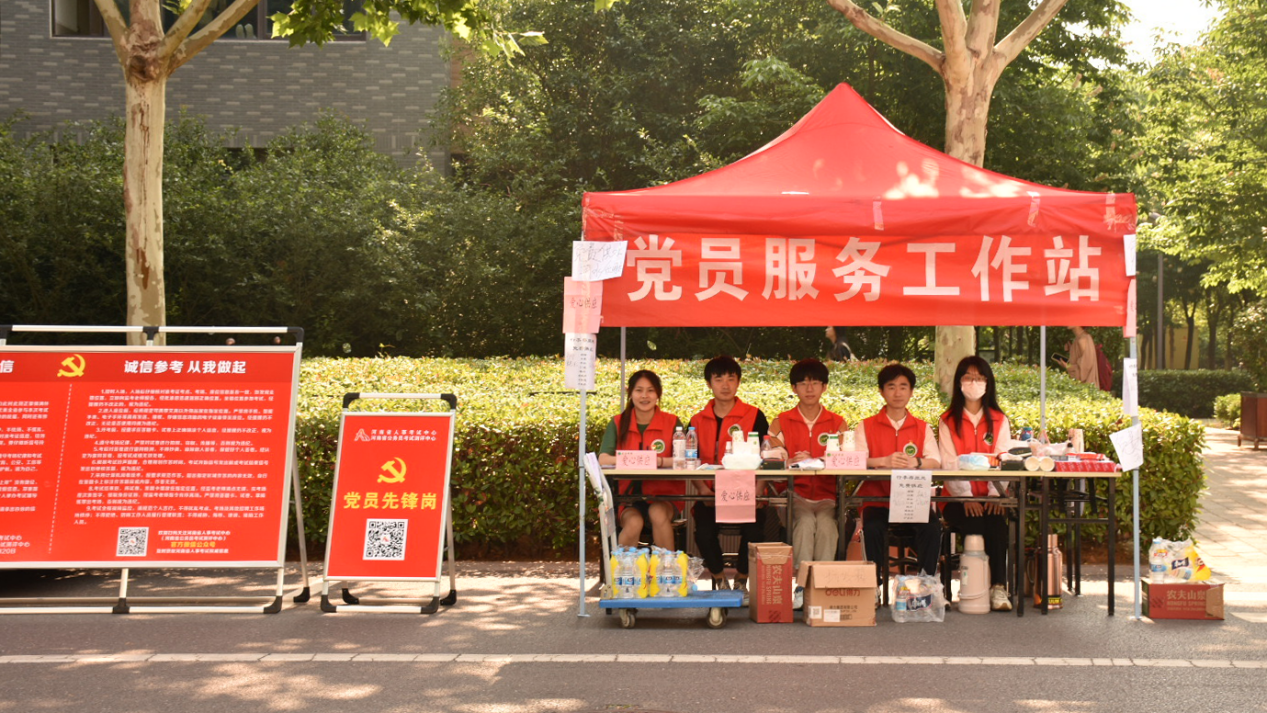 组织学生党员志愿者设立党员服务工作站,为考生提供服务。