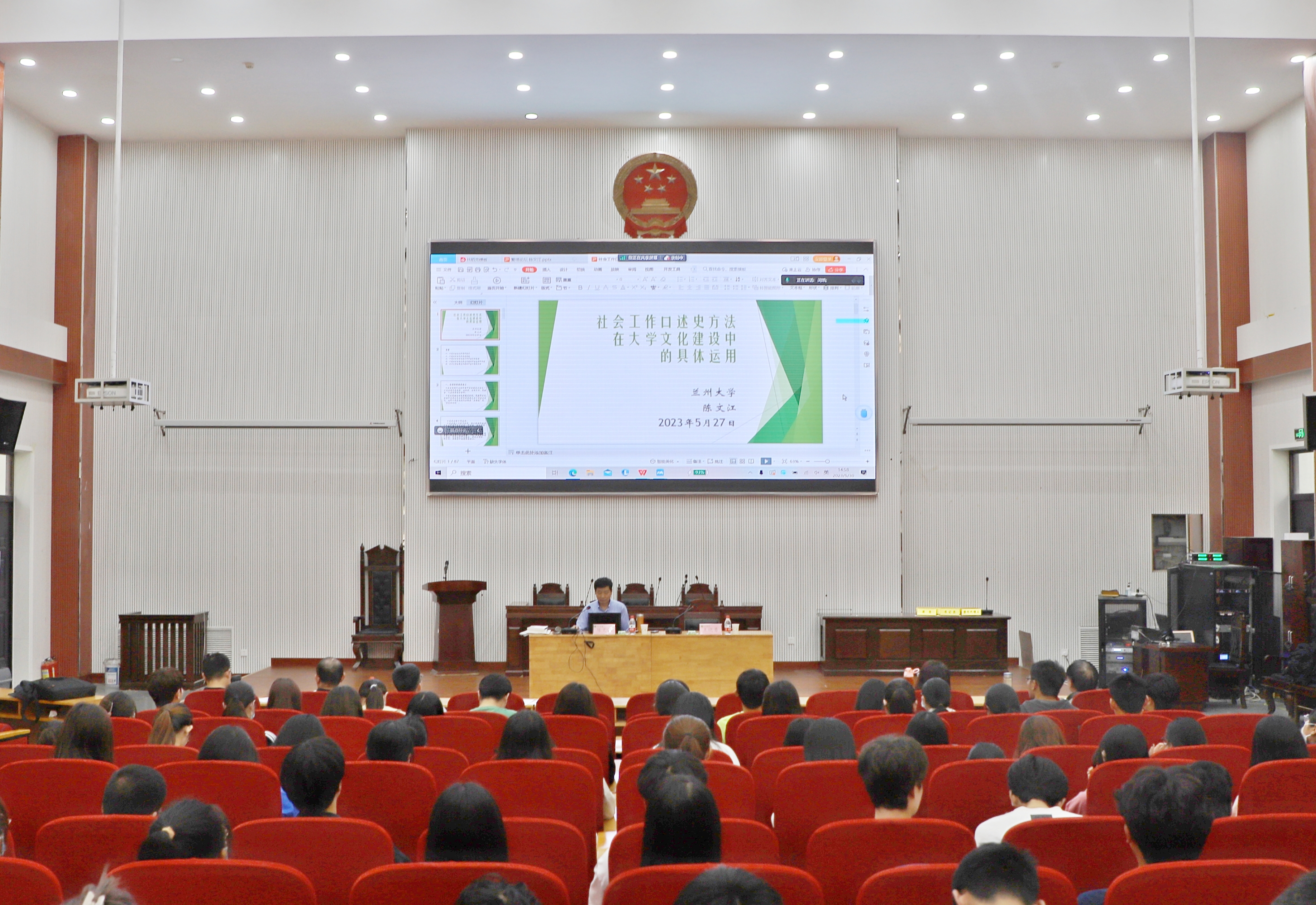 邀请兰州大学陈文江教授在模拟法庭为师生作主题为“社会工作口述史方法对于大学文化建设作用”的学术报告。报告会由院长王晓勇主持,副院长李伟、社会学系教师以及社会工作专业全体学生参加报告会。