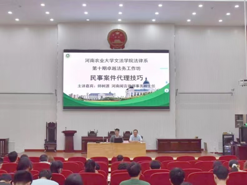 于龙子湖校区模拟法庭举办主题为“民事案件代理技巧”的第十期卓越法务工作坊,特别邀请河南闻言律师事务所主任师树源进行实务分享,法学专业学生参与,法律系主任韩宁主持活动。