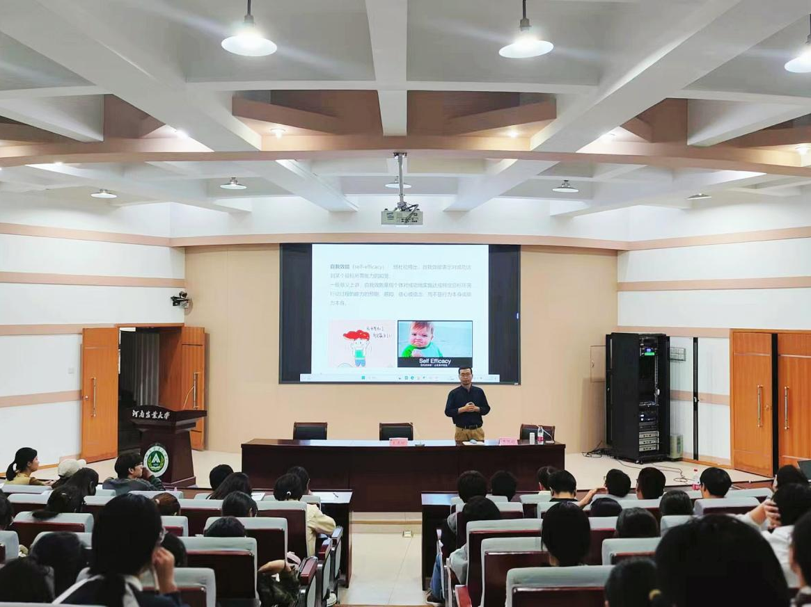 李国超从“人的自我”和“大学生活”两方面展开讲述。在“人的自我”方面,他用个人和身边人的求学经历以及各种新闻案例引入,启发学生加强自我意识,鼓励学生要对自我有更加清晰的认知。通过对“自我认知”“自我效能”等心理学名词的解释,引导学生提升心理素质。他指出,进入大学后随着生活环境的变化,学生在学业和社交压力之下产生心理上的焦虑是一种正常的现象,要正确对待这些变化,适当疏解心理压力。在“大学生活”方面,他纠正了学生对大学学习生活的片面认知,引导学生调整学习计划,合理安排时间,开启美好的大学生活。
