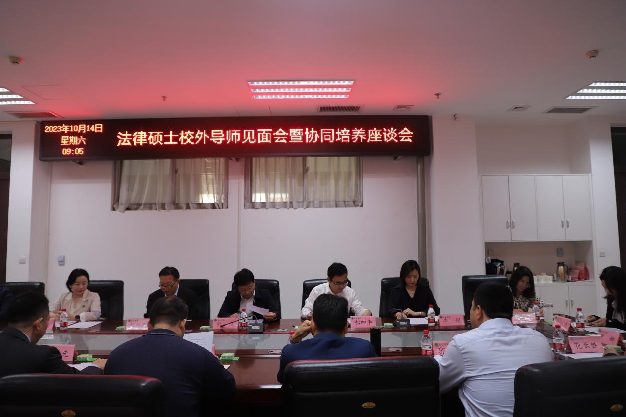 2023年10月14日上午在学院会议室举行法律硕士校外导师见面会暨协同培养座谈会。座谈会由副院长杨红朝主持。