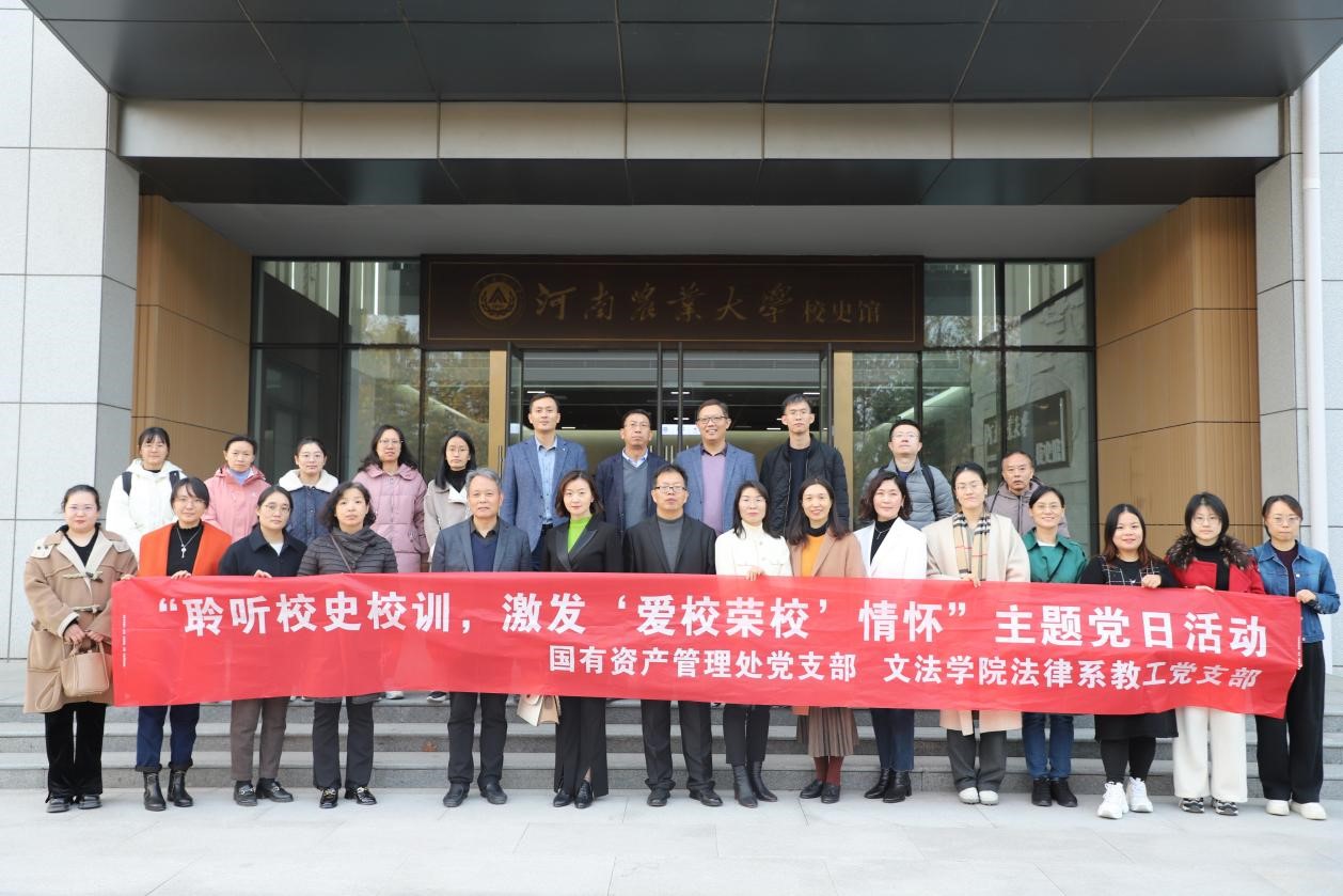 法律系教工党支部联合学校国有资产管理处党支部在龙子湖校区校史馆共同开展“聆听校史校训,激发‘爱校荣校’情怀”主题党日活动,学校国资管理处处长雷振华、学院党委书记牛娟参加活动。