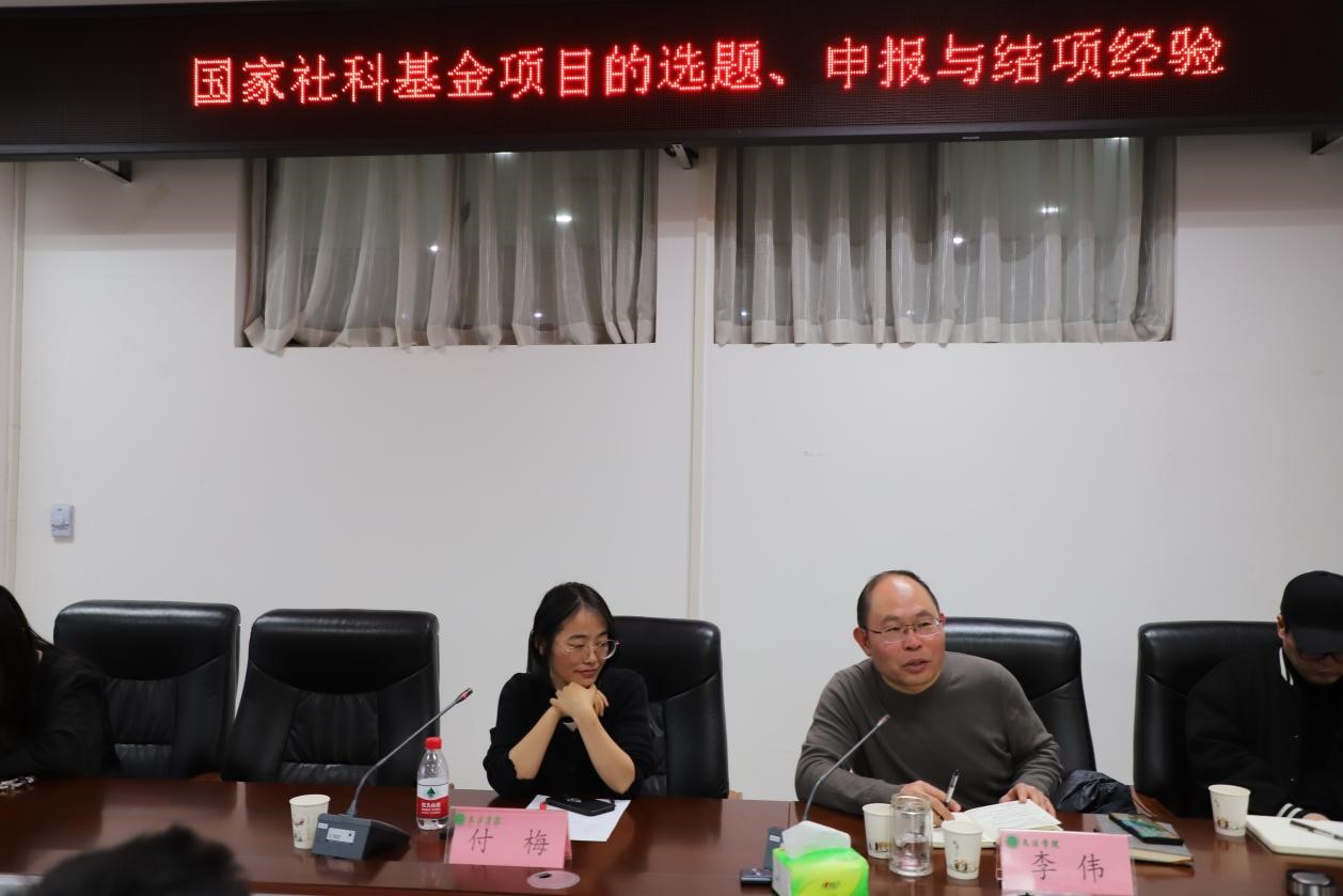 汉语言文学系教师付梅围绕国社科基金项目的选题、申报与结项经验展开交流。活动由副院长李伟主持,副院长杨红朝及部分教师参加。