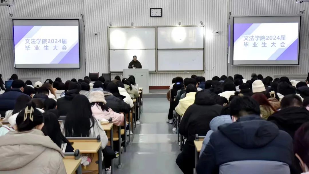 于龙子湖校区大教室5召开2024届毕业生大会。学院党委书记牛娟、党委副书记余果、全体辅导员和2024届全体毕业生参加本次大会,会议由余果主持。